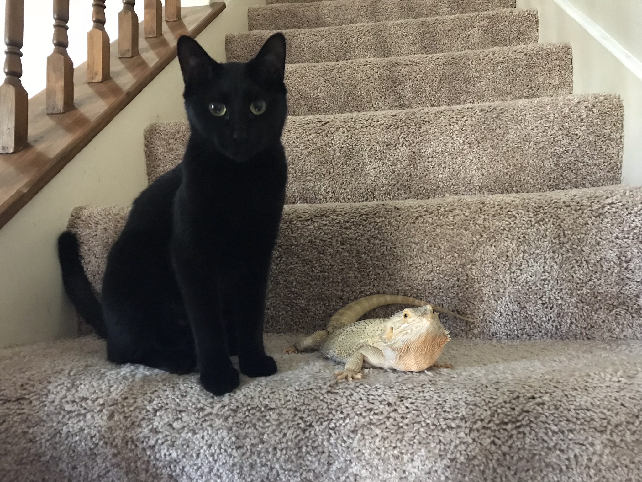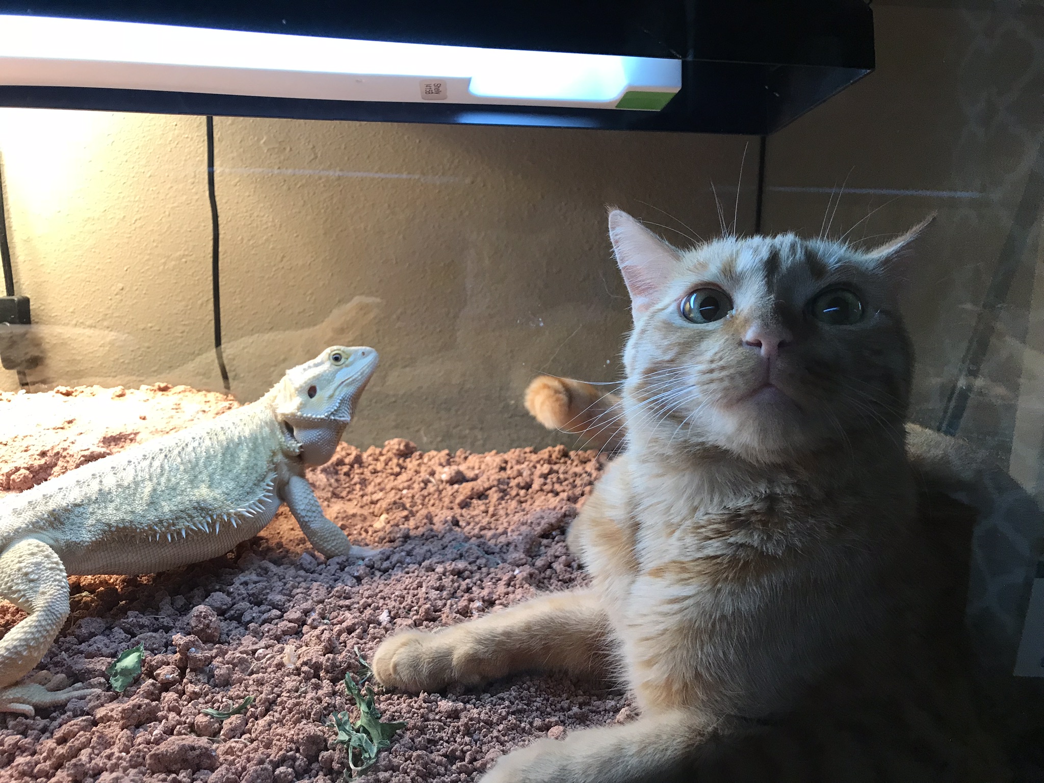 Горошек, дракончик был первым, ей год уже был, когда взяли первую кошку. Кошки не врубаются что это, вроде живое, а живым не пахнет Бегают за ней по дому, но не хватают, она может надуться и почернеть, они боятся  А Лили любит у неё в терре греться.