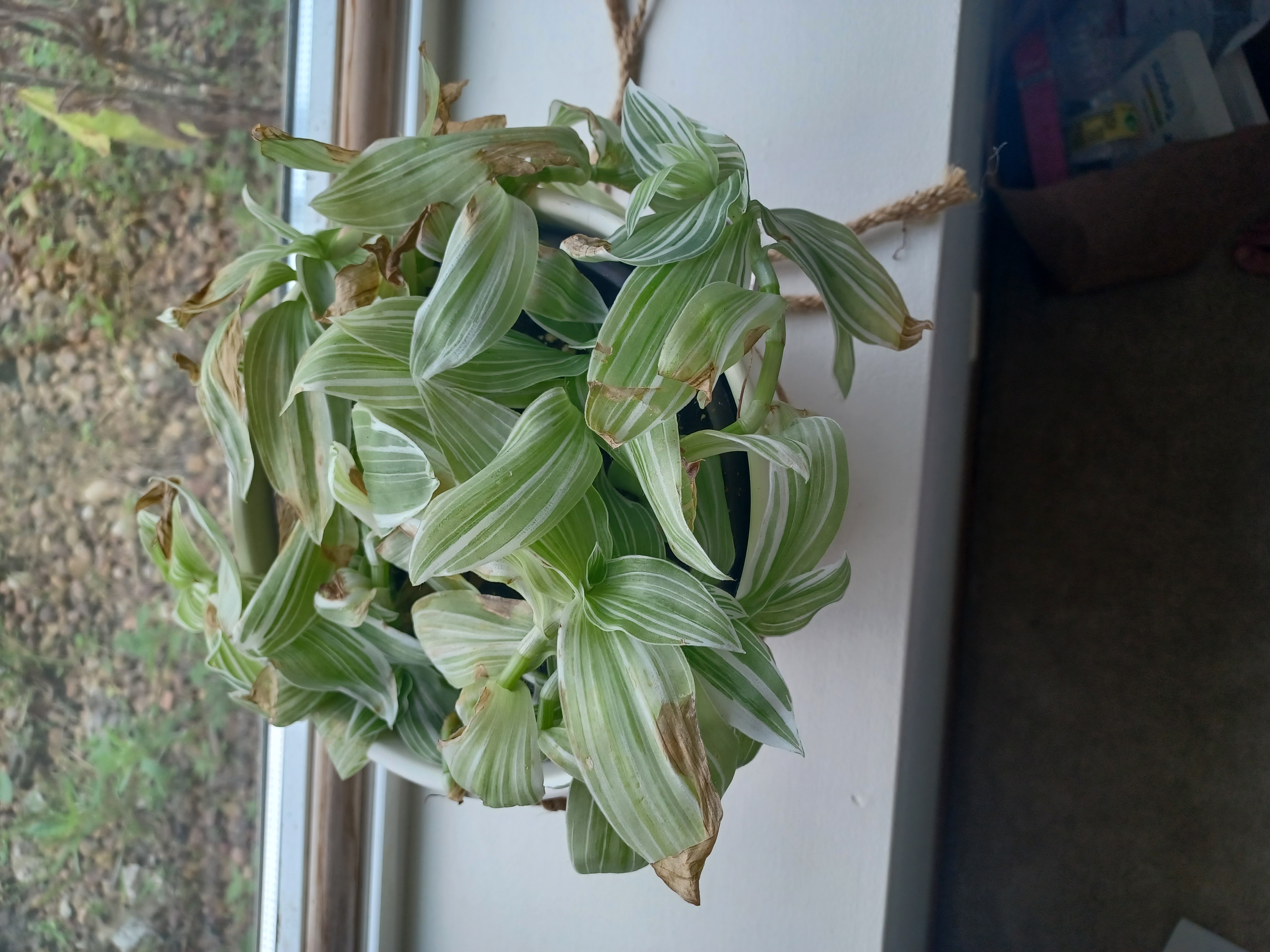 Это традесканция, всю жизнь прекрасно росла внутри помещений в садиках, школах, поликлиниках и т.д. Повесьте в светлом месте, иначе белые полосочки исчезнут.