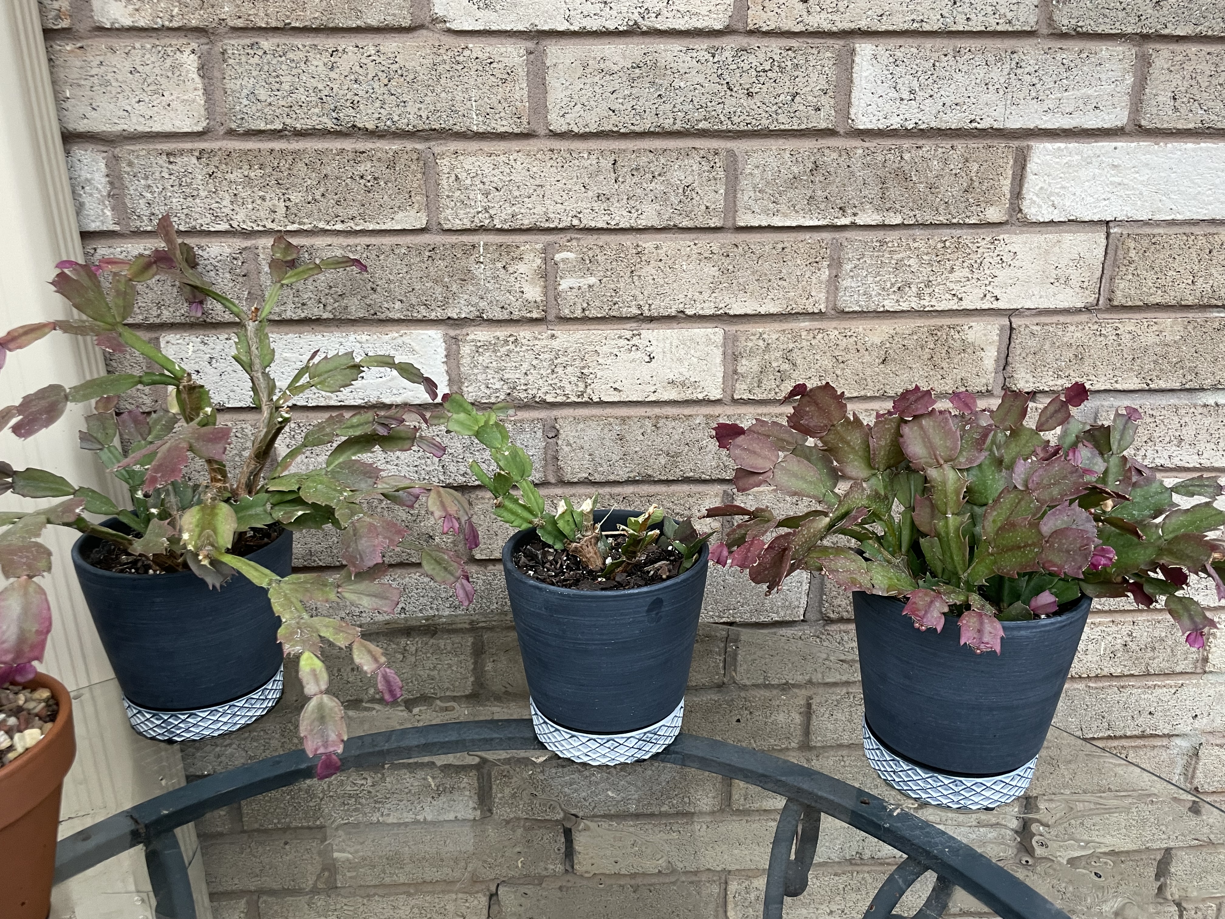 а вот и я думаю, почему красные только эти трое, которые в одинаковых горшках. В других горшках все зеленые. Они стоят не на полном солнце, даже скажем так - мало солнца на них попадает. А вот эти все равно красные. Сегодян обещали как бы заморозок. начала часть засовывать в шед - и на некоторых бутоны уже! Маленькие, с бусинку, однако уже полезли. Вот теперь баюс, чтоб не посбрасывали. Если заморозок отложет небесная канцелярия - вытащу все вЗад, пусть дальше закаляются. Кактусы я опять оставлю на улице, только накрывать буду при низких температурах, однако сукки , вероятно, придется затаскивать...Геморройное время подходит. Так что брызгать, вероятно, уже поздно. Кстати, не только вот декабрист объели. еще и у опунции одной целый лист оторвали и с концами. Она без колючек, и небольшая еще. так тчо я заметила. Но она-то хоть на земле стояла. а декабристы - повыше.
