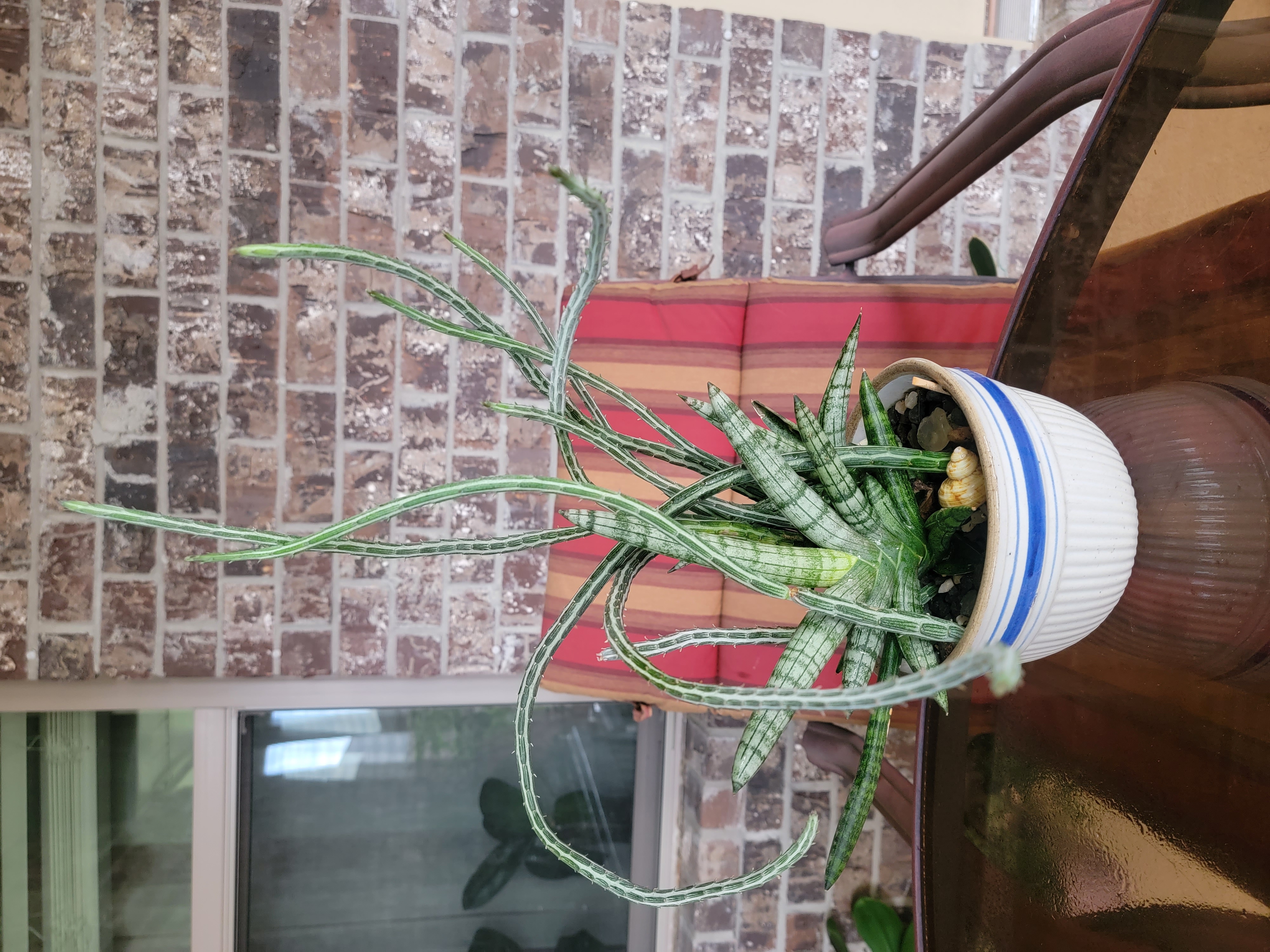 Вот такая крокозябра выросла, вернее две. Одна- сансеверия, а 2я- не знаю. Покупала крошечный горшочек с тремя палочками... Переехала сегодня inside.