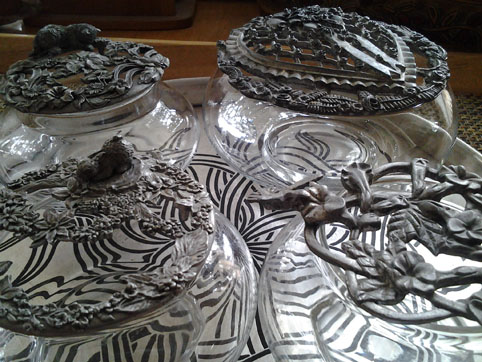 и вот такие коллекционные конфетницы или сахарницы, я их по одной покупала - с зайчиком, киской, птичкой и просто цветочками. и серебрянное итальянский поднос за 8 долл. :) это я себе, обожаю все итальянское.