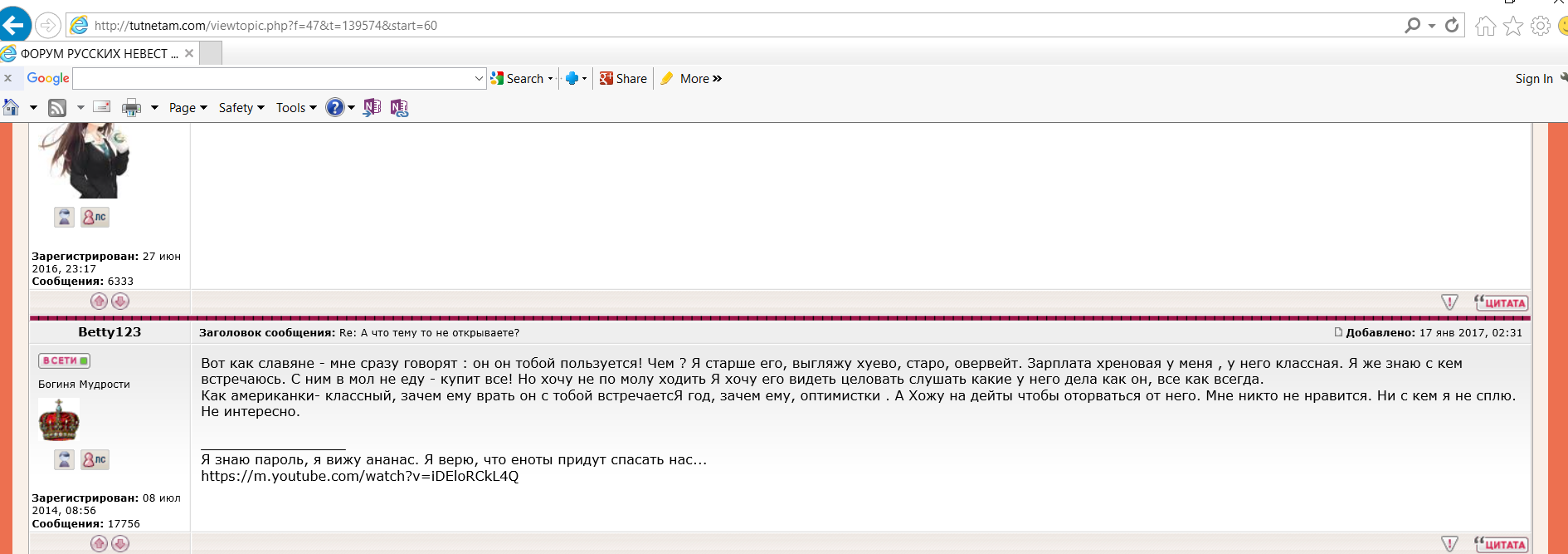 Betty123 писал(а): SantaMonica писал(а): Бетько, а что такого что женщины ищут серьезных отношений? Не все хотят быть сливным ведром для хитропопого мужика Там половина самые интересные ищут дейтинг, меридж ищут старые. То что видела я , что смотрели его профайл, у него написано обычный дейтинг без обязательств - переводить надо что это означает? Где то 35% черные - он белый. откликается на "Бетько"  лишь написать про этого нестоящего мужика.