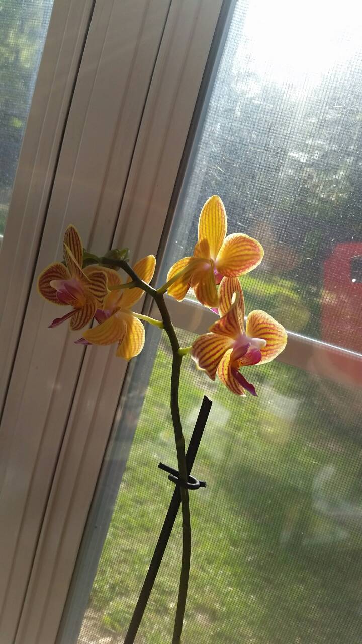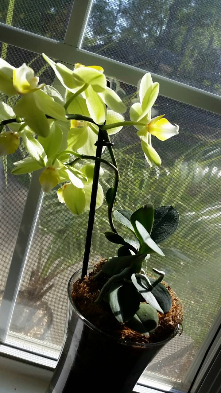 Окалахомчик, сочувствую, но надеюсь, что малой кровью все обошлось. Я помидоры высадила примерно месяц назад, аккурат перед последним фростом. Пострадали они, перцы и бананы. Но ничего, уже нарастили новые листья, завязали помидорки, перцы цветут, бананы прут... усё карашо Вот фото мужниной любимой "лимонки". Это мини, но цветы крупные, как у обычной орхи. Вопрос: почему у нее цветонос с листьями? В прошлом году такого не было
