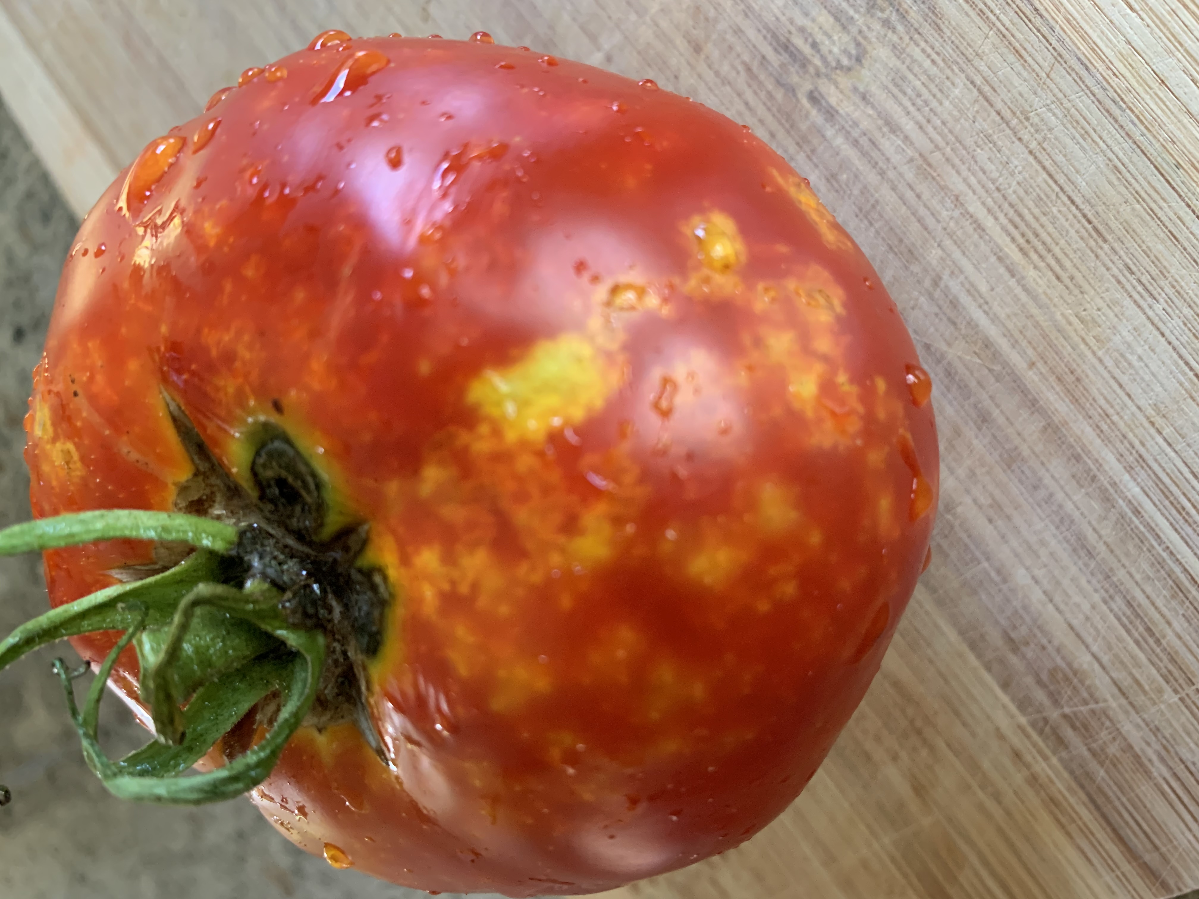 Что за белые пятна на помидорах? Такого ещё на было. Когда разрезаешь, то они под кожицей, дальше не распространяются.