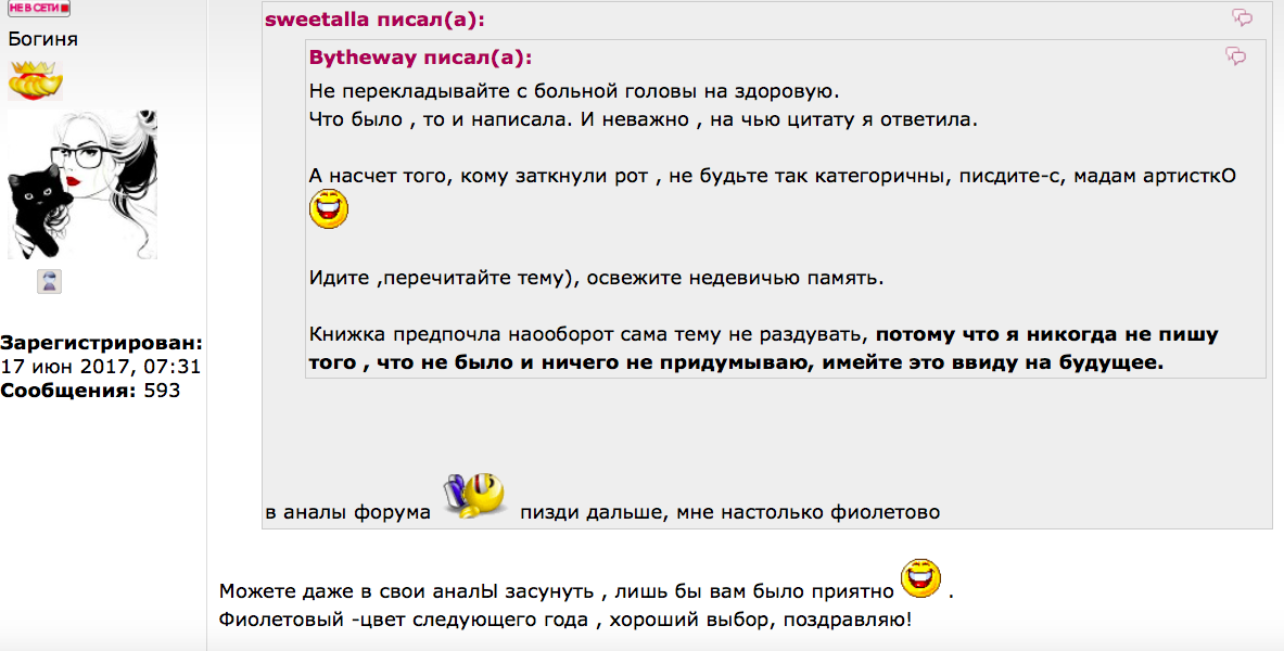 кОта писал(а): sweetalla писал(а): кОта писал(а): Девушки, помните, недавно тема была про помощь от американского жениха для больной девушки из Москвы?Закрыли ее.Так вот, она умудрилась Тане Генерал написать в "Страну советов". Смотреть здесь https://www.youtube.com/watch?v=0w6Uq7j44qA та девушка не писала ничего генерал. таня генерал стащила все с нашего форума и сделала этот ролик. там в комментах эта девушка пишет об этом. и генерал прокололась в своем видио......в письме автора, которое якобы она получила ничего не было о сумме долга ее отца....а генеральша озвучила 15К потом позже в своем видио. девушка написала нам на форуме о сумме, когда мы ее стали спрашивать. генеральша подробно читает форум. некрасиво она поступила. Свиталла, когда я смотрела видео, комментария девушки еще не было, сейчас прочла.Ничего себе, поворот событий. Согласна с Вами, недостойный поступок. Интересно, что ответит Генерал и ответит ли. честно говоря, я считаю что если бы эта больная девушка хотела заработать денег, то в Москве это можно сделать не выходя из дома. я один раз в одной передаче по тв видела даму с инвалидностью (она ходить почти не могла), так она просто из дома работала оператором " на телефоне" для какой-то фирмы по доставке пиццы на дом. деньги не большие, но всё же лучше чем ничего.