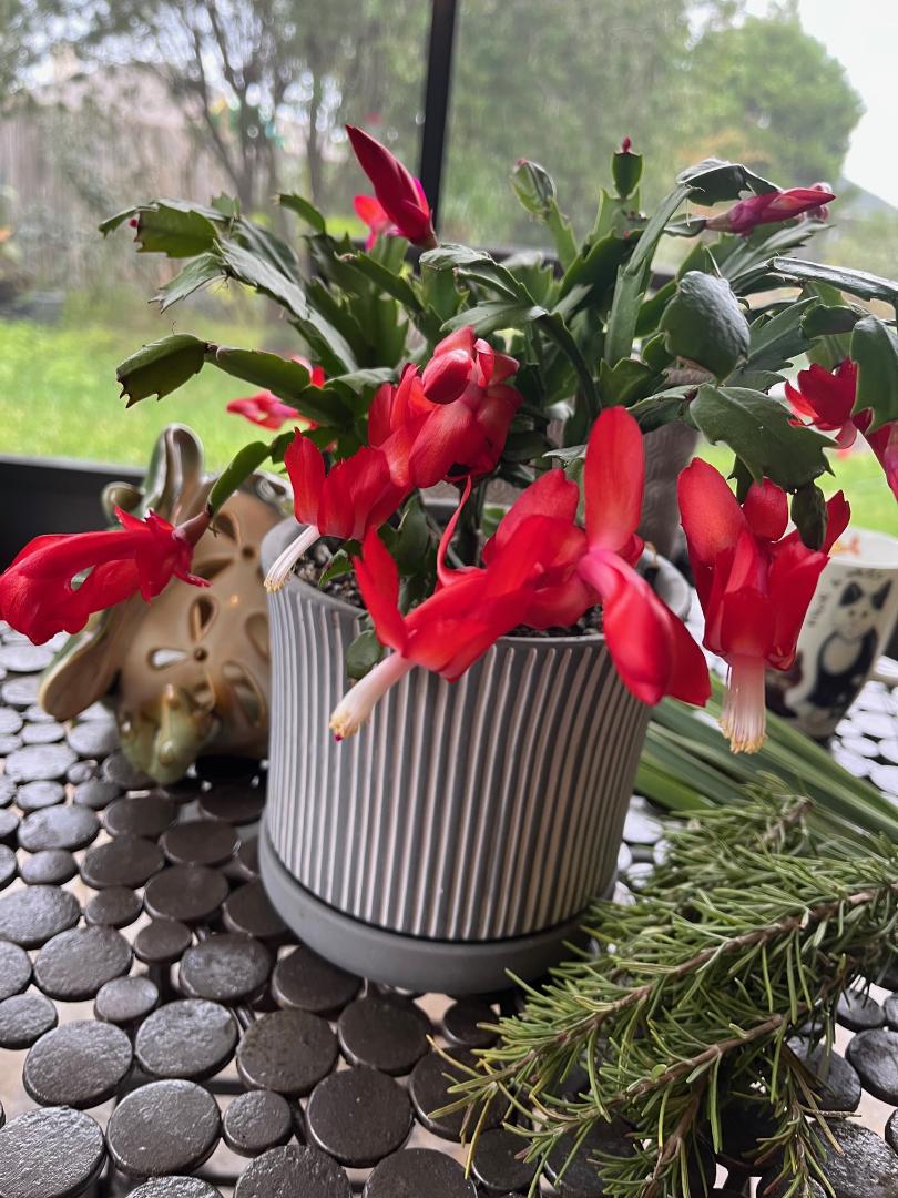 Я опять с декабристами...  Поняла, почему они меня не трогали. Обычно я видела бордовые, а бордовый цвет я не люблю. А этот- ало-красный! Мои любимые цвeта ,как раз красный, белый, синий-голубой, фиолетовый. Вот сейчас бархатцы цветут оранжевые, никак меня не трогают, даже несколько глаз раздражают. Вообщем, надеюсь, чтп этот красный разрастется. Заметила, что очень неприхотливый. Я его туда-сюда таскаю- хоть бы что. Кто знает , они один раз в году цветут, или еще будут? А...еще колеусы меня поразили.  Из пакетика за 2$ семян из фреш маркета , уже огрoмных размеров вазон разросся. И на клумбы присадила..Короче, из семян растет просто отлично!!!