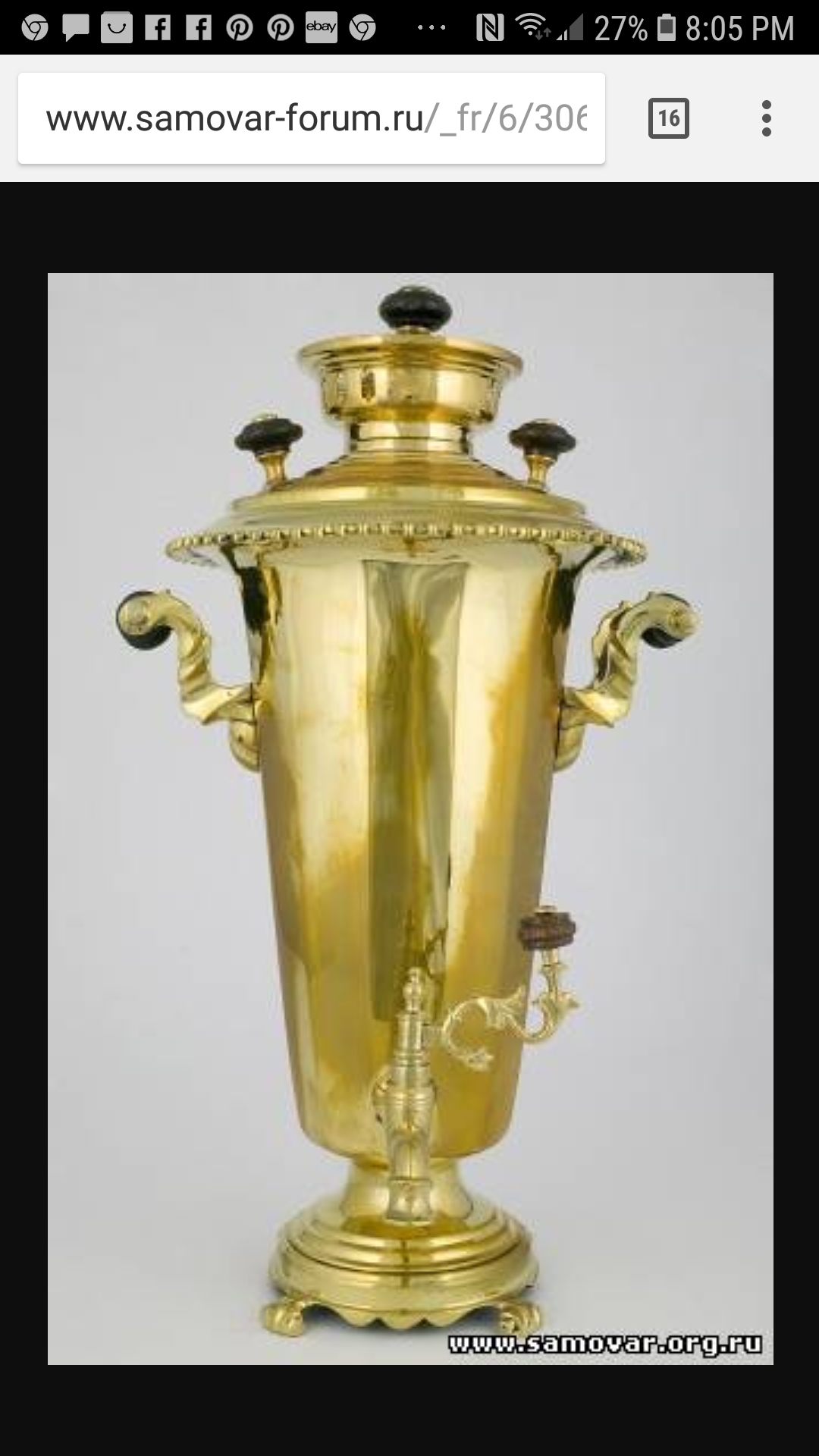 Déjà vu писал(а): Angela777 писал(а): не вижу печатей на этой штуке Эта штука называется самовар. Не печати а медали и клейма. Крышки же нет на фото потому не видно. Спасибо за лексическое исправление моего неродного, но неплохого русского языка (бормочу под нос, хорошо хоть не набросились с обзыванием тролем). Если есть медали, читать их и брать, этот самовар, хотя его форма довольно необычна