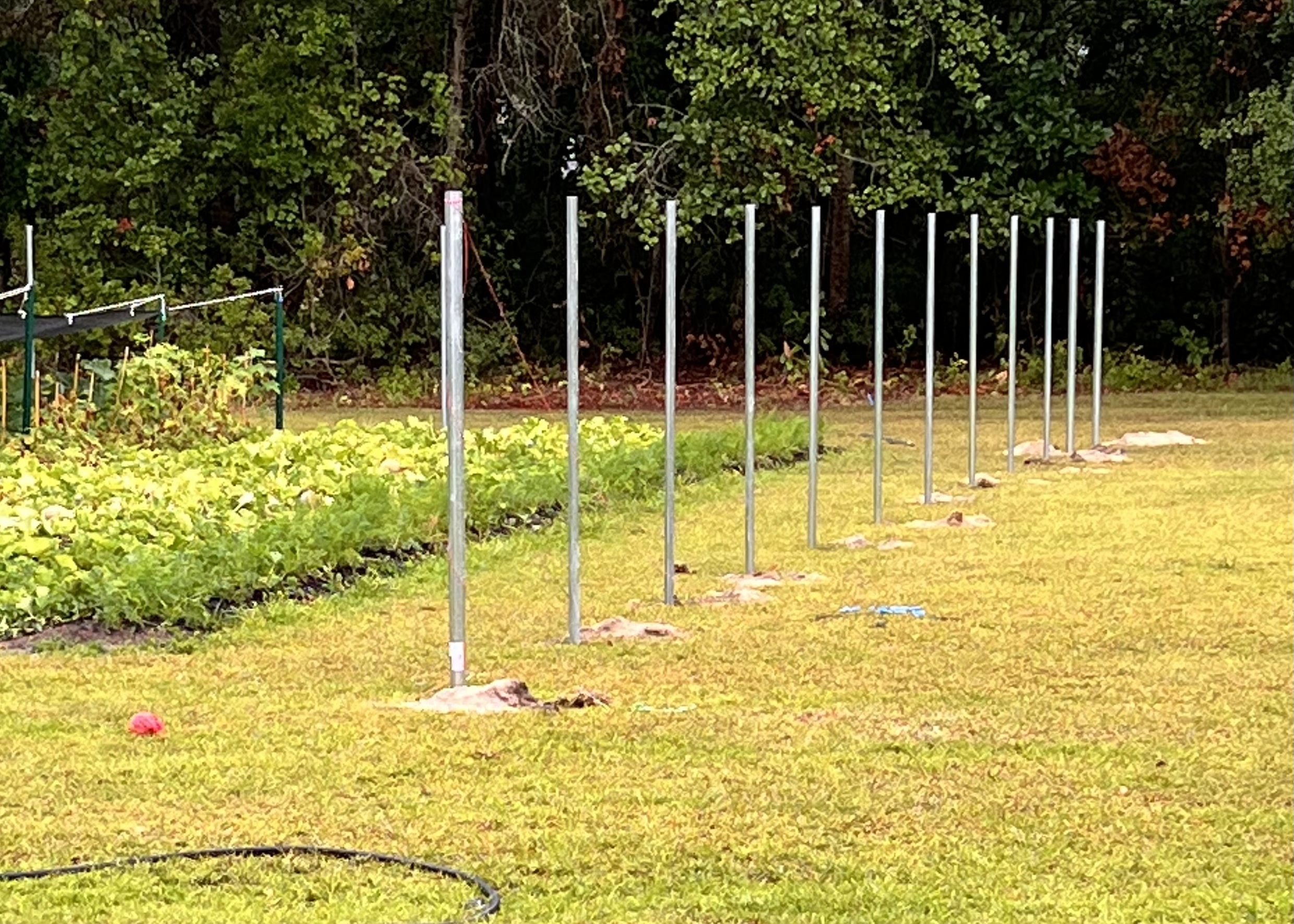 Мой потихоньку строит забор- сетку. Тяжело работать в жару, хотя сегодня жара спала после хорошего ливня.