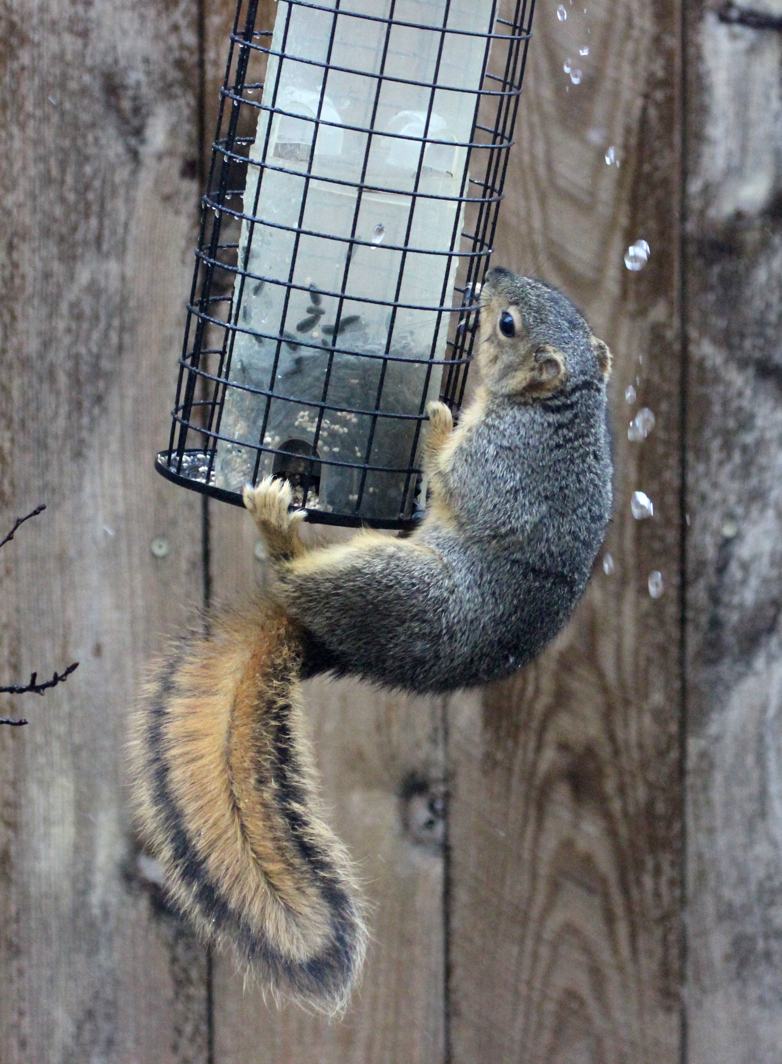 Чем спасаете кормушки от белок? кормушки всякие есть, сверху вот как раз для всяких поползней и дятлов (другие птицы тоже пасутся, и белки тоже). Вторая - это для брикетов, да, она висит на цепочке. От белок никак не спасаю. Белки залезают даже туда, куда вроде как не должны. Ну и ладно. Рассыпают только, вот это мне не нравится. У Валенсии кормушка вон противобелочная. Но там тогда птиц не сфоткаешь - так что я такую не стала покупать. Оклахома, славные фото! А кардинал - загляденье просто, у меня много жен его на кормушках,а самого не видно - может в разводе зимой? Противобелочных кормушек наверное ещё не изобрели. Вот у меня белки что вытворяют - крышку от кормушки не могу найти, заткнула колбу с кормом сверху пакетом - вот что эти бандитки делают.
