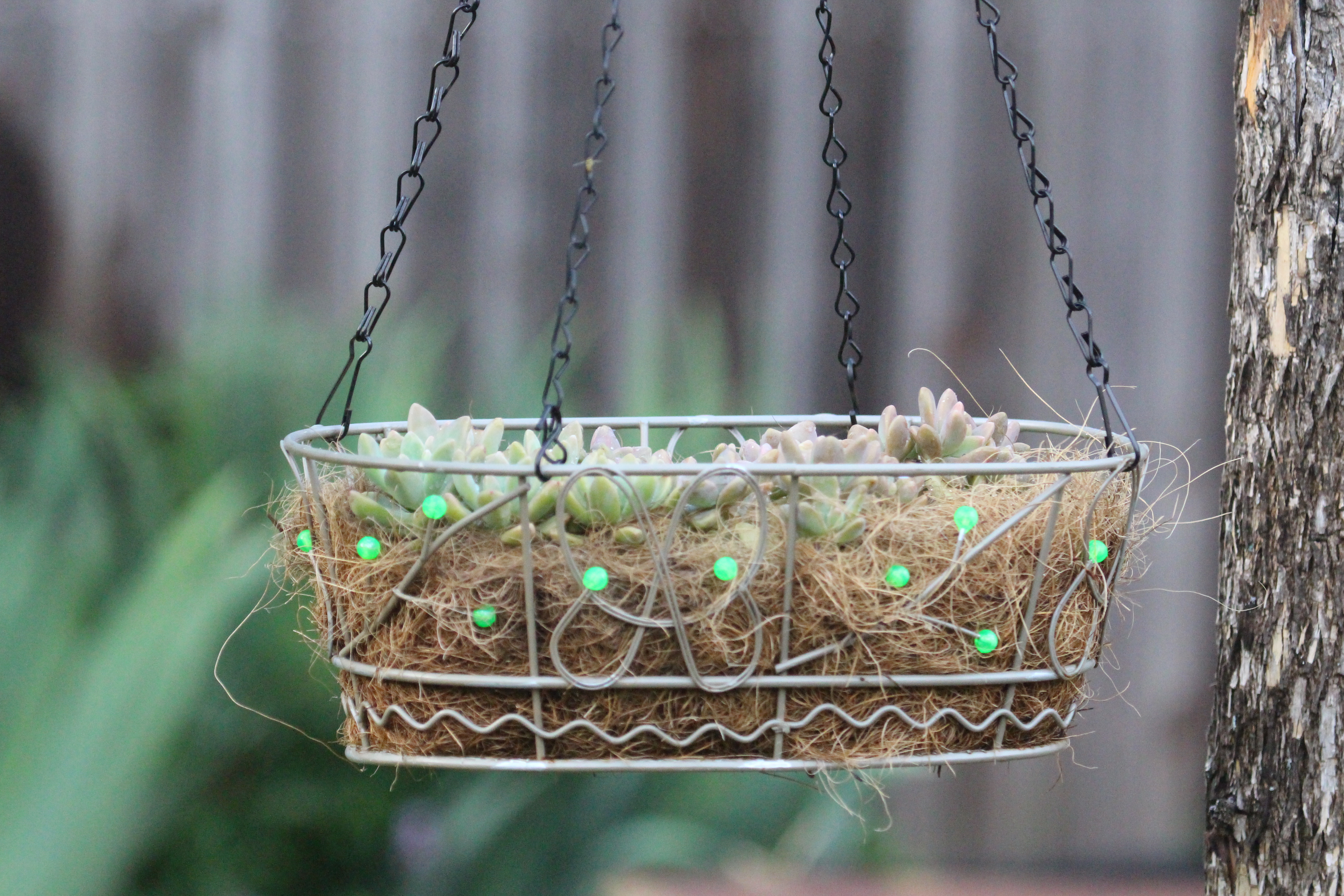 Я не помню, где вы живете, но они не морозостойкие. Я заношу в холодную теплицу. не поливаю совсем. Пока ваши малыши, можно и в горшке растить. Так вы нашли этот седум? Год-то полюбому в горшке будет нормально, а за это время что-то найдется. Можно не искать именно подвесные именно корзины - любое сооружение ж можно подвесить на цепочках и крючочках. Я показывала - String of Banana вот у меня в ночнике висит  Была сегодян в гудвиле - еще там подобные два штука стояли, но не той формы и расцветки. какой бы мне хотелось. Вместо корзины можно любую квадратную или какую еще металлическую конструкцию встретить и опять же - на цепочки-крючочки. картинки своих свежих висюлек поставлю чисто для примера, во что можно посадить висячие растения. Там еще все очень мелкое, только что воткрутое, посмотрим, как за сезон распушатся. Попрошу обратить внимание на люстру  в нее вставлена дырявая корзина для фрай картошки (покрасила краской-спреем за две секунды, была алюминиевого цвета она, мне не нравится) Будет что-то еще, более подходящее - можно поменять. Люстра сама мне нравится Другая висючка с зелеными бусинами - тоже перекрашу на днях, пусть все будет в одной гамме. также самые обычные пластиковые (можно не пластиковые, что захотите, то и пойдет) горшки прекрасно висят в каконитамназываются - такие из макраме подвески. Стоят копейки. Забейте на ибее что-то типа Plant Hanger Macrame Hanging Planter Holder и вуаля. А уж на Алиэкспрессе еще дешевле. Вот картинка с ибея, сссылка слишком длинная получилась, ну найдете. там их море.