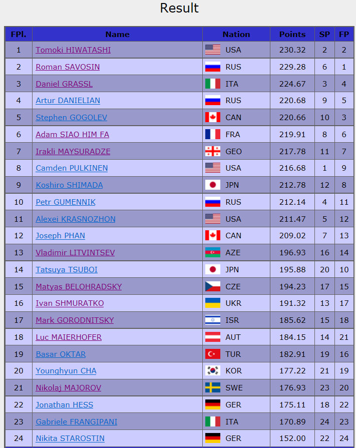 Маттео классный, приятно посмотреть, Ковтун по сравнению с чемпионатом Европы, так просто красавчик Самарина жалко, мне кажется он очень старается, много работает, но не получается. Лазукин тоже не плох был, сказали больной с температурой выступал. Ничего особенно от наших мужчин не ожидаю, так что спасибо и серебру на Универсиаде