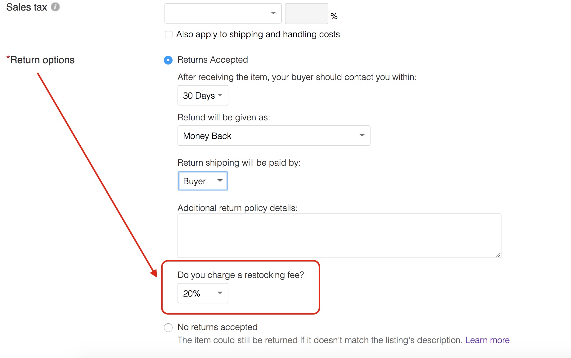 В самом листинге в Разделе "Return options" надо установить в графе "Do you charge a restocking fee?" Смотрите фото. Когда будет возврат, от суммы автоматом отнимутся ваши фи.