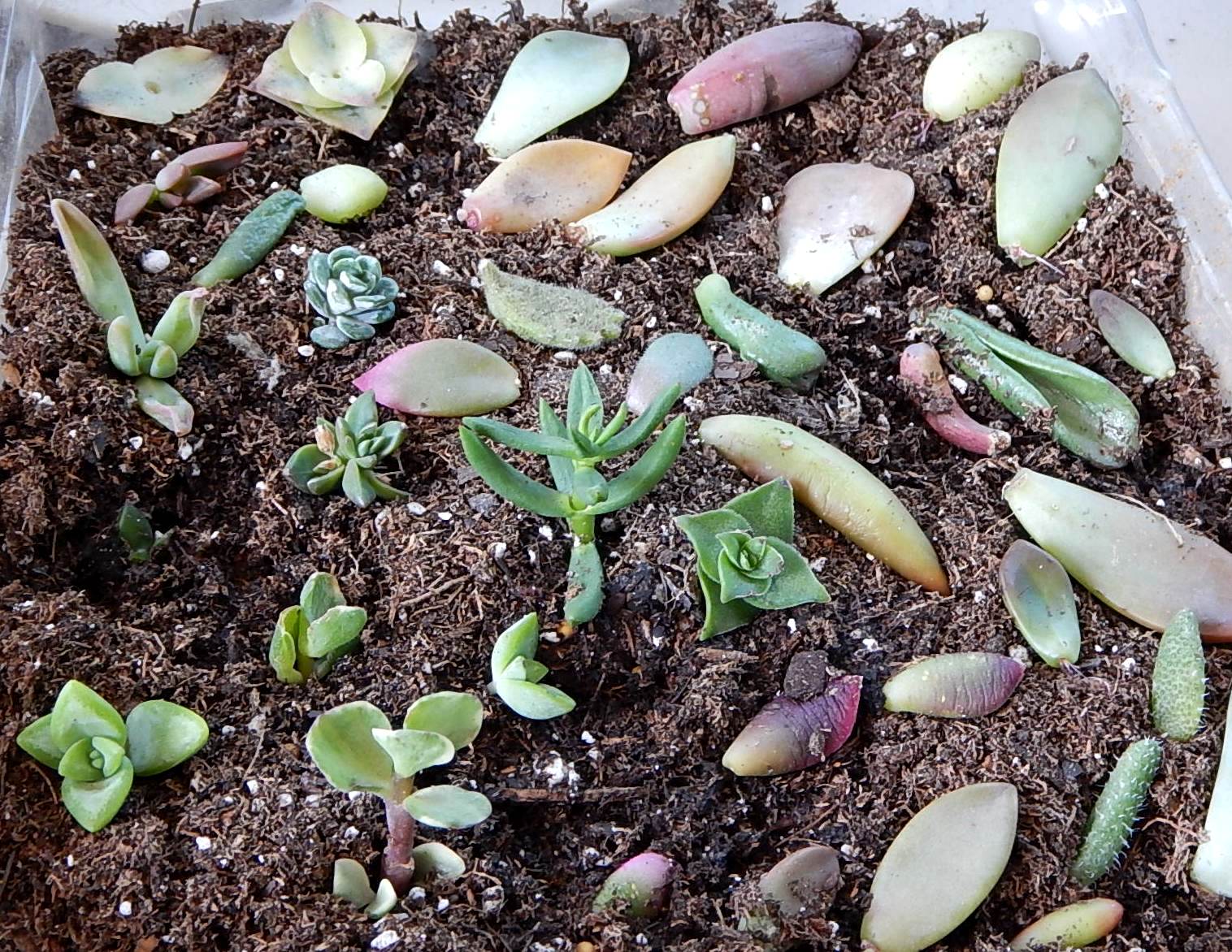 Jaxi писал(а): Еще про сукки хотела спросить. Положила листики на почву- ни один не дал корешков-все сгнили. Может все же их садить надо в землю, а не просто укладывать? мне кажется, что на земле они быстрее дают корешки. Не закапывать, просто разложить по поверхности, даже чуть увлажнить почву (символически). У меня первая порция была именно вкопанная - они очень долго вылезали. Хотя, может быть, это потому, что зима была. Сейчас корешки выпускаются очень быстро. Вот у меня несколько таких плошек стоят на разных стадиях  ракушку вазу на гаражке нашла, новенькая была