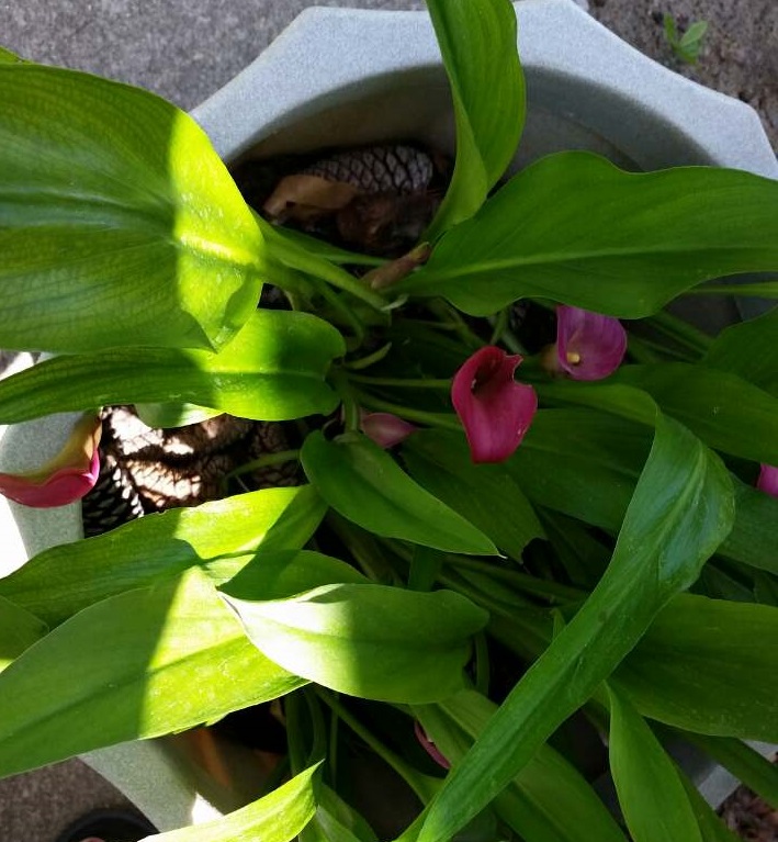 Оклахома, успела сфоткать калу между ливнями. Посмотри, должно быть видно, что новые ростки и цветочки все лезуть и лезуть  Прошло 2 недели после пересадки в болото. Еще 2 недели подождем, потом, если усё окай, скажем Адолоче большое, человеческое спасибо и забудем о них до холодов