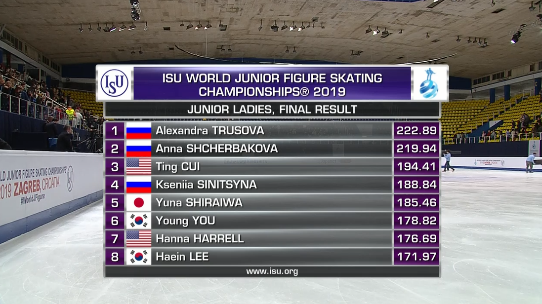 Трусова перепрыгала сегодня Щербакову, хотя Щербакова, как по мне, смотрелась лучше. А что же новоиспеченная чемпионка США не приехала? было бы интересно посмотреть на нее и наших на одном турнире. надеюсь у Косторной не очень серьезная травма? Чемпионка США не приехала, потому что по возрасту не проходит, ей не было 13 лет на 1 июля 2018. На юниорском чемпионате мира действительно очень мало народу было, на произвольной девочек хоть небольшое количество людей было на трибунах, а на остальных выступлениях вообще никого. Если бы в Москве соревнования были наверно полные трибуны были бы.