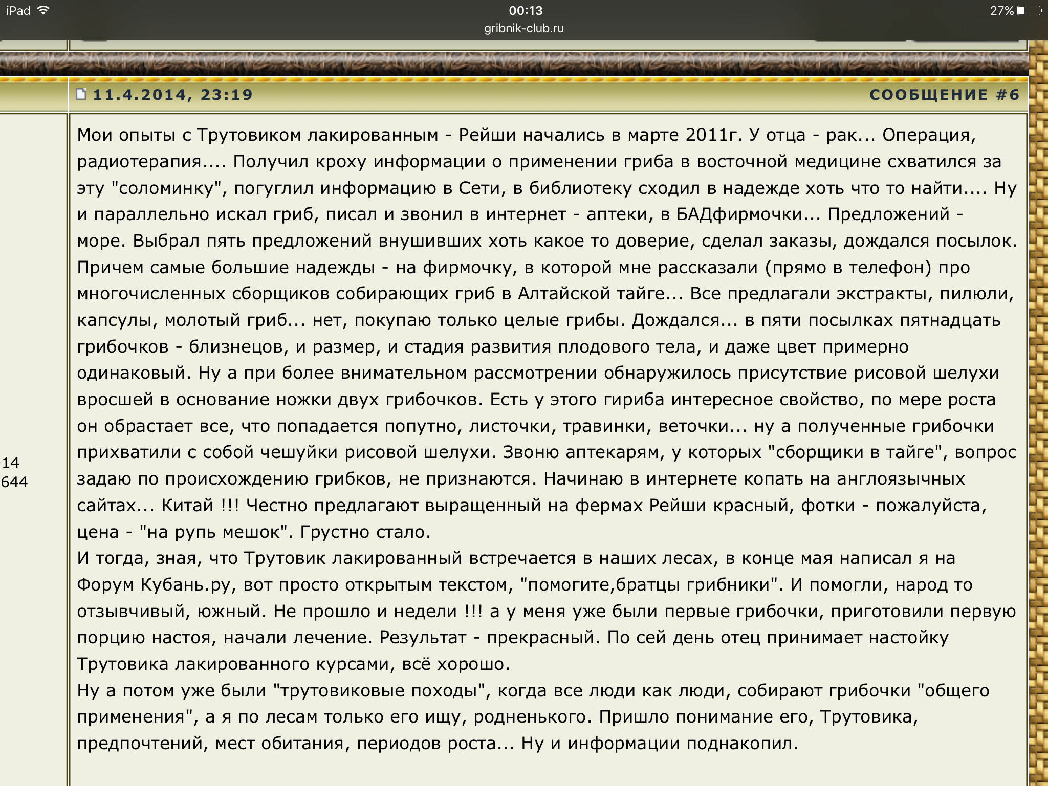 Martina писал(а): Вот золотая находка. Рейши - гриб долголетия. Вот здесь о нем на грибном форуме интересно обсуждают https://astromed.club/p237985902-kapsul ... plyus.html Как уже писала, нашёлся только на одном пне на несколько квадратных километров. Я срезала этот, что на фото для идентификации, убедилась и засушила для настойки. Остальные - пару маленьких аккуратно стала растить, навещая этот пень время от времени. В конце сентября срезала, добавила к первому. На том пне ещё обнаружила очень старые, чёрные протухшие лопухи этого гриба, оставшиеся с предыдущего года. Разнесла их по соседним пням. Но не уверена в успехе. Пишут, что они очень капризные для размножения. Нужно, чтобы сошлось много факторов воедино . То есть , если купить на амазоне мицелии, то они не приживутся?