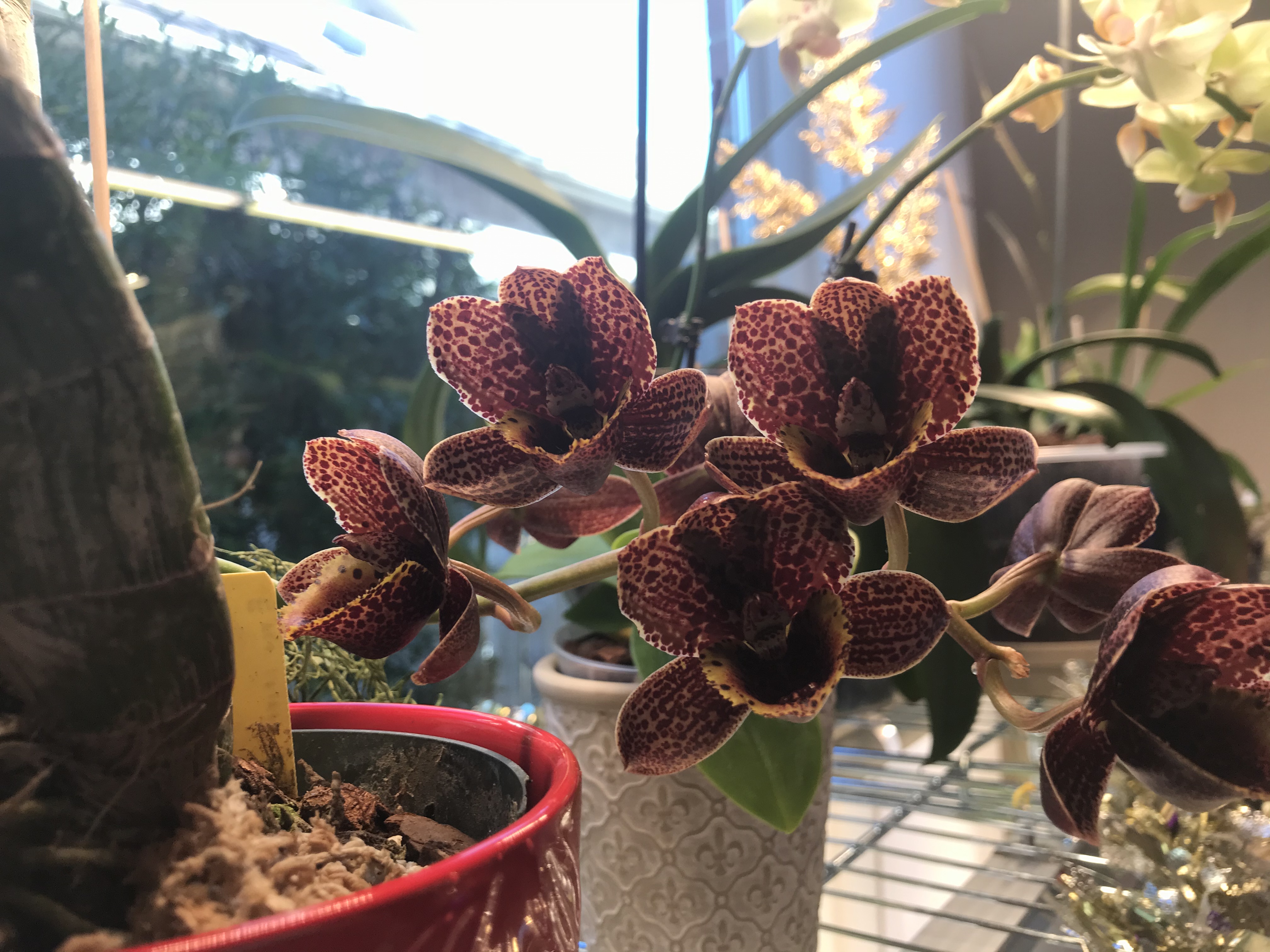 Adolocha писал(а): Хеленка, здорово!! Я так подозреваю, что твоё семейство тоже просит не приносить в дом новых растений? Мой уже чуть не плачет:-) Смотрю, ты в лекке выращиваешь? Как поливаешь? Это ЗС? Как тебе лекка нравится? Я ее побаиваюсь, это же глина, если пересохнет, то воду из корней отсосет? Или нет? Поподробней про полив, плюсы и минусы лекки. Мешаешь с чем-то? Довольна? Видела у многих на видео, но пока не решаюсь. А что на последней фотке на верхней полке в красном горшке? Какой-то листопадный дендр? А каттлеи у тебя давно? Цветут регулярно? Они с 1 или 2 листами? У тебя прям джунгли! Понравилось, что Ванду прям на стенд и подвесила. Прям в точку  Это ещё не все, цветущие стоят по всему дому. Вчера при обмене запросов на подарки мои обреченно вздохнули увидев мой запрос на посещение большой орхидейной фермы в Хьюстоне и соответственно кэша чтоб там потратить В керамзите я держу реанимашки каттлеи чтоб корни нарастить, мильтонии тоже пока новые бульбы наращивают, и энциклии с этой же целью. Потом все пересаживаю в кору. Они не в ЗС, в дырчатых горшках и поставлены на поддоны с водой или в керамические горшки с водой на дне. Я пробовала Фалы в лекку, не пошло, мини ещё ничего, а у больших долго просыхал и я пересадила обратно в кору. Поливаю по мере просыхания по краю горшка, проверяю палочкой бамбуковой. Лекка хороша тем орхам которые не требуют полного просыхания. Но вот каттлеям для наращивания корней подошла тоже. Каттлеи с лета у меня, кроме трех все с Лоуса реанимашки, не до цвета, наращиваем росты. Три я покупала у спецов, домашним ещё не цвели. Я с ними только только нашла общий язык, из всех орх оказались самыми капризными.