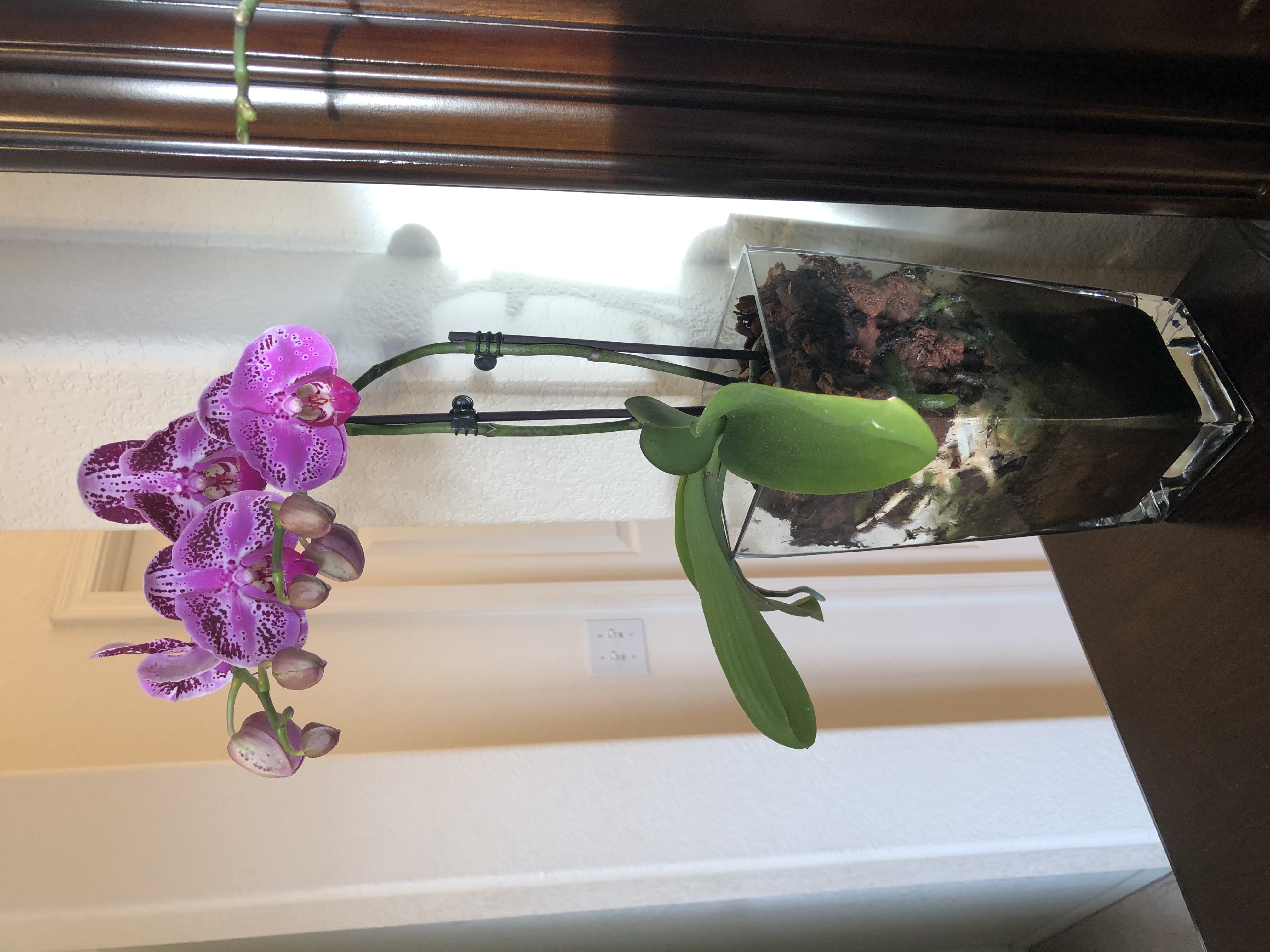Обрезала вот этому красавчику цветоносы Da Shang Sparkle fire. Цветы увядали, только распустившись. Хоть корни и выглядят зелёными, но внутри они поплавлены азотом. Осталось только пара воздушных. Жаль, собирался пышно цвести Арлекин.