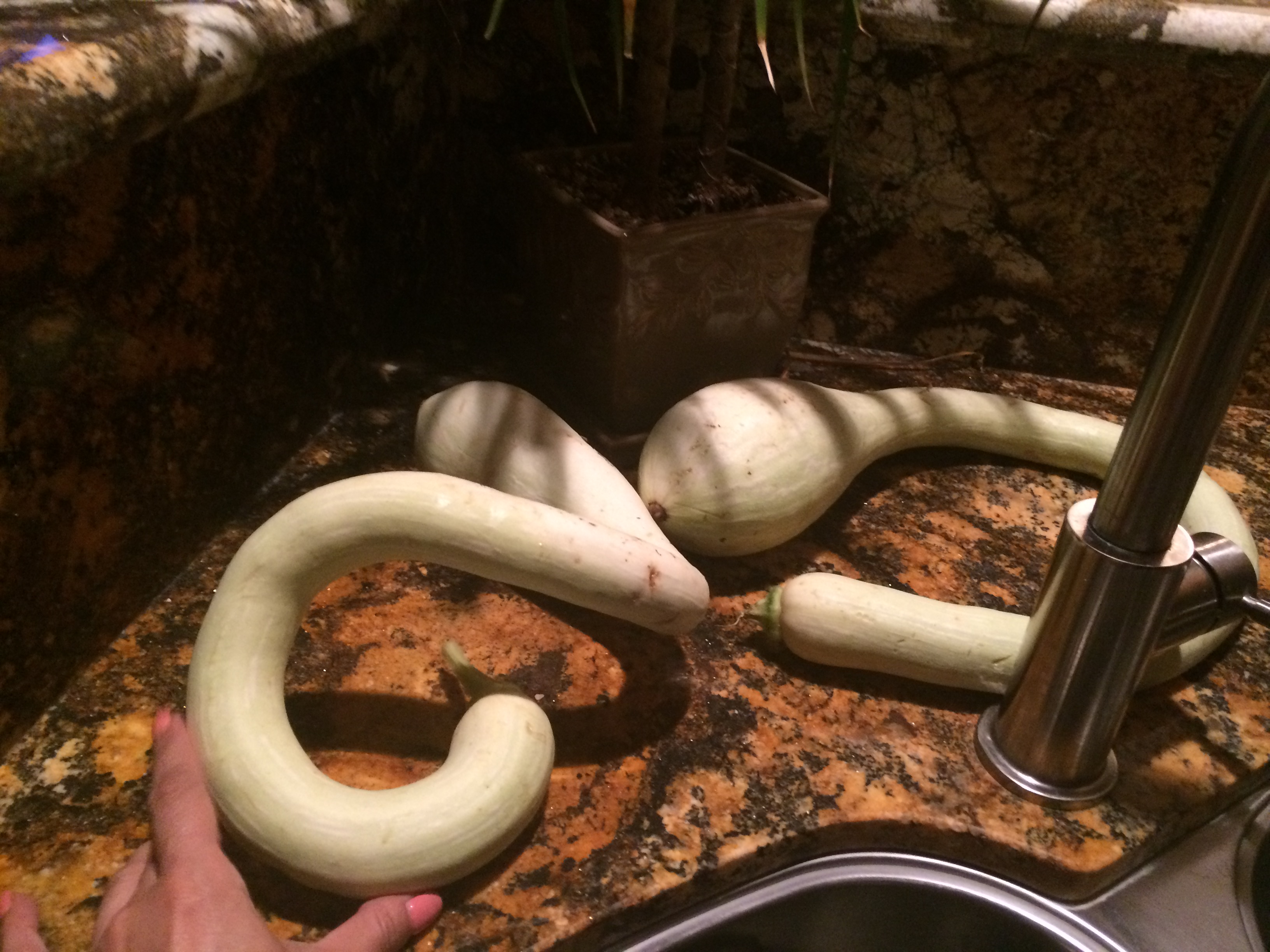 Смотрите, какие штуковины вырастила. Только не спрашивайте, что это такое и как определила зрелость. Возможно, не доспели или уже переспели. Цукини, вроде. Но растут крючковидными , с головкой. Потом уходят по спирали. Сорвать сорвала. А есть боюсь. На змей похожи. И фаршировать по серпантину не умею. Зато вырастила. В кустах ещё такие закорючки лежат. Как думаете, дать им ещё подрасти, или наоборот пораньше сорвать?