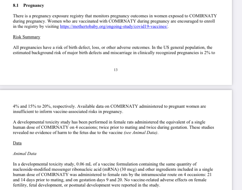 Если почитать Pfizer vaccine insert, то там в пункте 8.1 тоже черным по белому написано про испытаниях вакцины на крысах касательно беременности и ни слова о людях. Кстати, и ссылка на сайт прилагается, куда FDA просит женщин обратиться, зарегистрироваться и поведать, как у них протекает беременность.