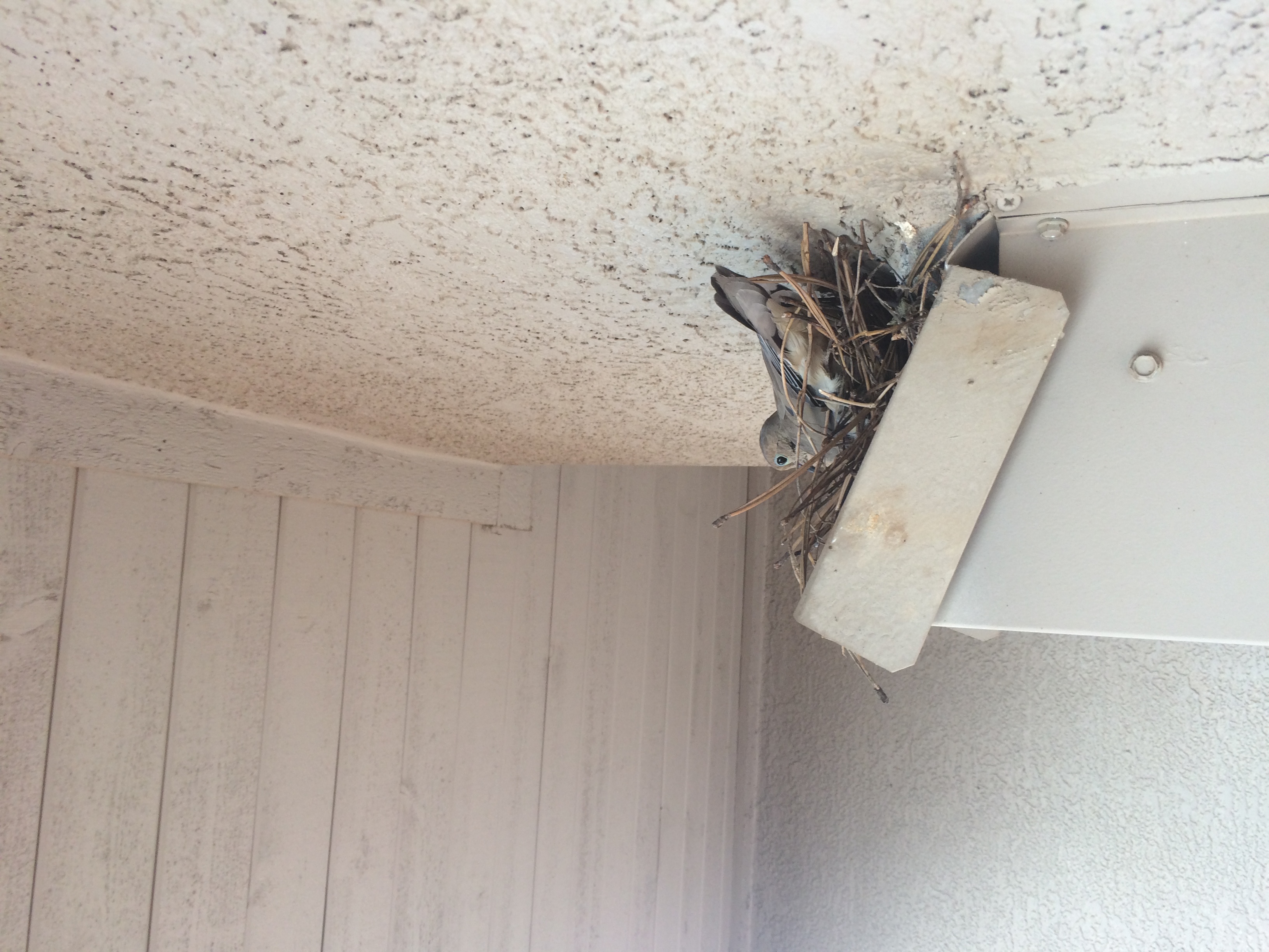 Сидит и не боится. Над креслом, где я цигарками балуюсь, у двери на Бэк. Так тихо сидит, что и не заметила, когда там гнездо появилось. Муж высокий, вышел с проверкой, гнездо бровью задел.