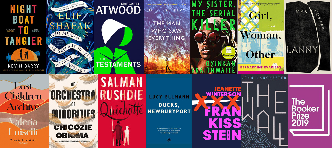 Margaret Atwood (Canada), The Testaments (Vintage, Chatto & Windus) Kevin Barry (Ireland), Night Boat to Tangier (Canongate Books) Oyinkan Braithwaite (UK/Nigeria), My Sister, The Serial Killer (Atlantic Books) Lucy Ellmann (USA/UK), Ducks, Newburyport (Galley Beggar Press) Bernardine Evaristo (UK), Girl, Woman, Other (Hamish Hamilton) John Lanchester (UK), The Wall (Faber & Faber) Deborah Levy (UK), The Man Who Saw Everything (Hamish Hamilton) Valeria Luiselli (Mexico/Italy), Lost Children Archive (4th Estate) Chigozie Obioma (Nigeria), An Orchestra of Minorities (Little Brown) Max Porter (UK), Lanny (Faber & Faber) Salman Rushdie (UK/India), Quichotte (Jonathan Cape) Elif Shafak (UK/Turkey), 10 Minutes 38 Seconds in This Strange World (Viking) Jeanette Winterson (UK), Frankissstein (Jonathan Cape)