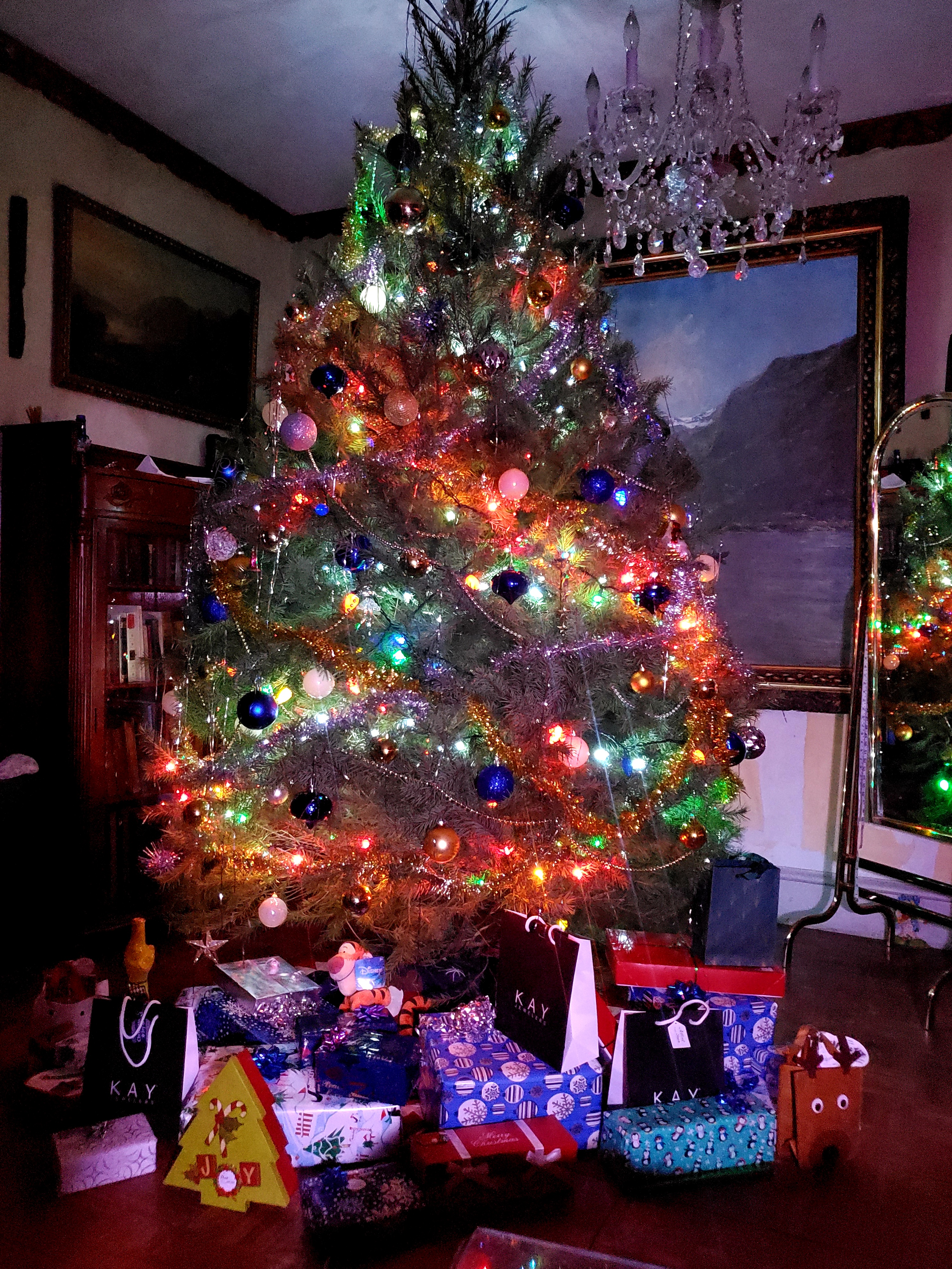 Украшена по-старому, под интерьер, который тоже не молод, как и хозяева). Игралась несколько лет в современные елки, они не подходят дому. Но рекомендуюмых цветов придерживаюсь ради игры. В этом году предлагались синие зеленые золотые и серебрянные украшения. Честно говоря, я согласна с теми, кто сказал они офисные, хоть и шикарные. Дома хороши елки с игрушками разных эпох, лет, семей, если есть дети, то их цепочки всякие, неуклюжие поделки. Приятно достать игрушку с историей, как со старым знакомым встретиться - привет, курилка, еще год проживем вместе)