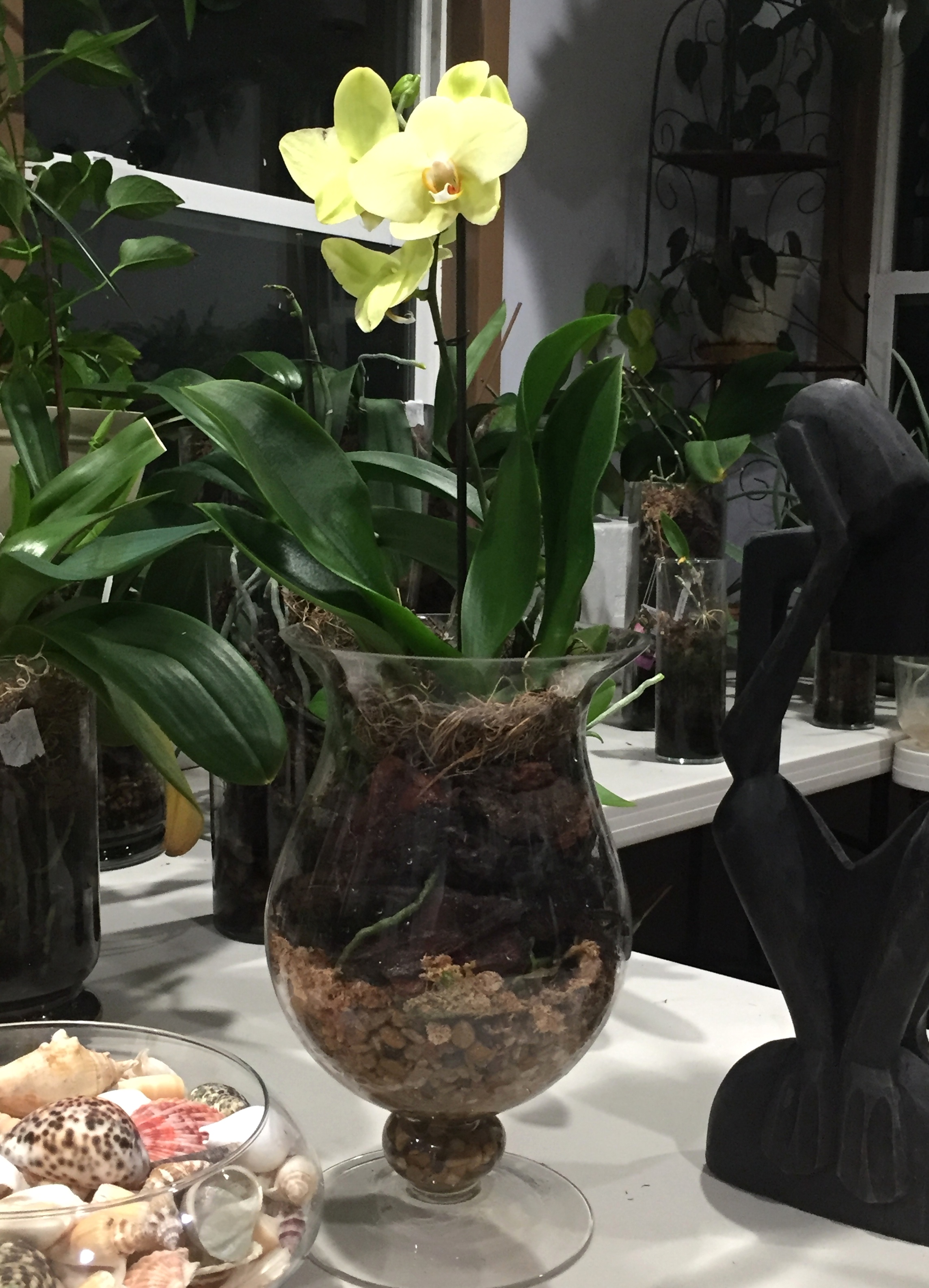 Соблазнилась сегодня на зелененькую. Вроде нет еще у меня таких. Хотя точно не уверена  , еще только стрелки все растят, к весне начнут распускаться, думаю. Сразу пересадила в вазу. ну и малышка еще цветет , у нее необычные листья - серебристые, как в инее, на фото не очнеь видно, темно.