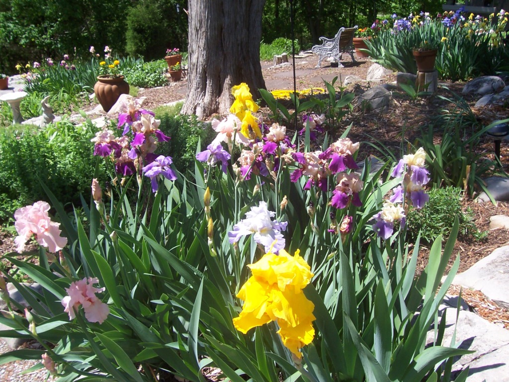 ах, какой фиолетовый  просто облако... Знакомые, видимо, горячие ирисопоклонники?  Радуга просто...все же как жаль, что они недолго цветут!  Что потом, просто зеленые листья в царстве ? или что-то подсажено?