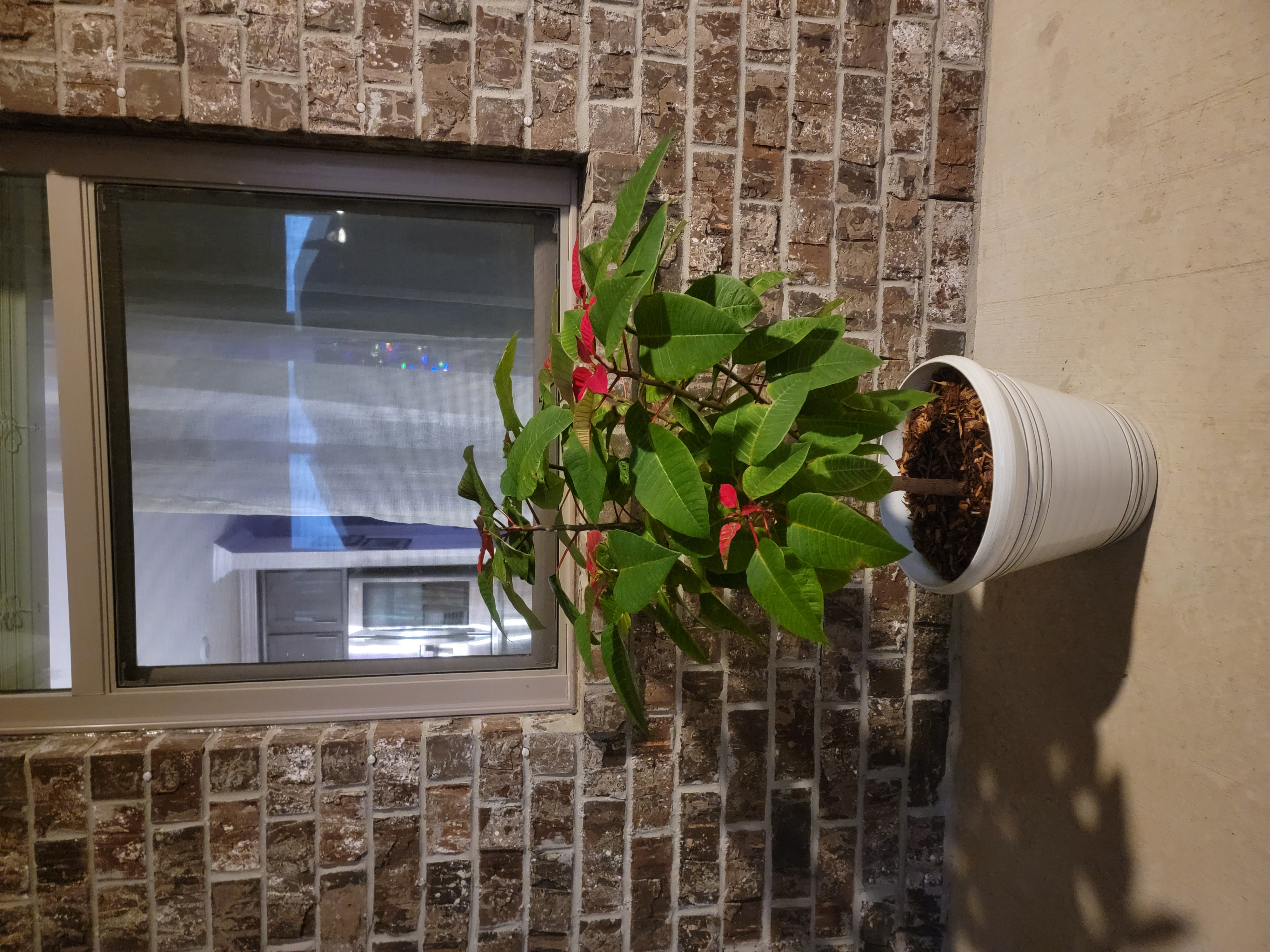 Почти в ночи выкопала одну из 4х пуансеттий. Запихнула в горшок. Очень даже ничего, боковая обрезка пошла на пользу. Еще не вся окрасилась... поставлю на фронт порч, пусть народ радует. Единственное, осень была жаркая, и я ее недополивала. Поэтому листья далеко неидеальные. Ну, учту на следующий год.