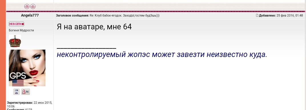 Angela777 писал(а): Lada_T писал(а): Aнжела ты же вроде не дура ну нафига ты гонишь с этим фбр ip тюльпан .... заладила Ну потроилила немного но что вообще делать нечего? уже не смешно а выглядит все это глупо Нет. Совсем не дура. Тюльпан и на форуме открытым текстом мне угрожала шантажируя какой-то информацией, которую она якобы на меня нарыла. Сегодня этот же шантаж старание запугать меня якобы ФБР. Это нормальный человек? И АйПи совпало с тюльпаном и ФБР кащенко с авоськой. Не надо здесь на меня наезжать, разберитесь сами в этом колхозе. Сама сиди в этом колхозе У тебя уже невроз с параной появился. Сидя тут 24/7 ну или тролишь неумело Я тебе кроме шуток говорю Выглядишь ты прямо скажем глупо