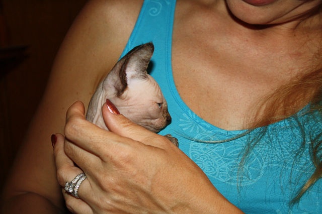 мне нравится такой сфинкс! голубые глазки! не линяет! наверео нет аллергиина нее? или всетаки аллергики на кожу кошек реагируют?