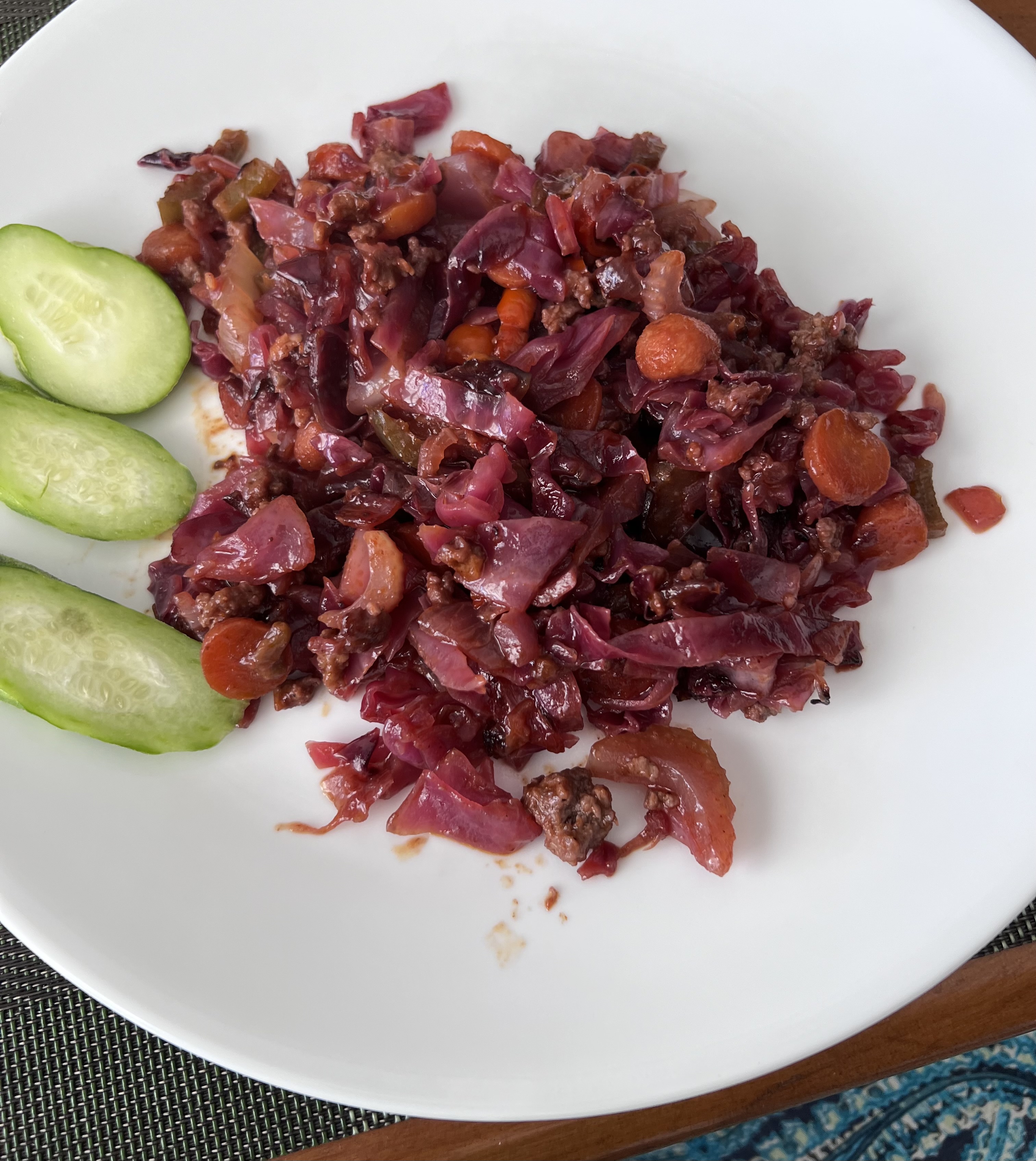 Потушила краснокочанную капусту с мясом на ланч. Просто, стильно, низкокалорийно!!