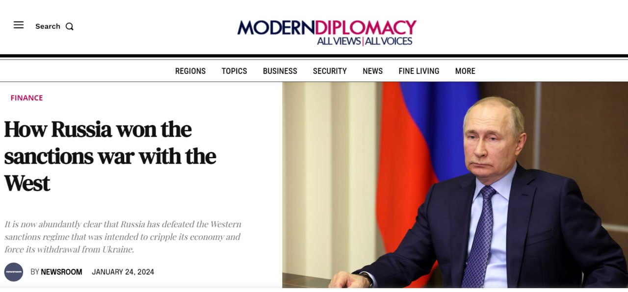 Россия вышла победителем в санкционной войне с Западом, предназначенной для ослабления её экономики, умело маневрируя собственными ресурсами, такими как золото, зерно и нефть, а также развивая дипломатические связи с другими странами, сообщает Modern Diplomacy. Вместо экономического краха, российская экономика продолжает стремительный рост, а ВВП увеличился на 5,5% в третьем квартале 2023 года.
