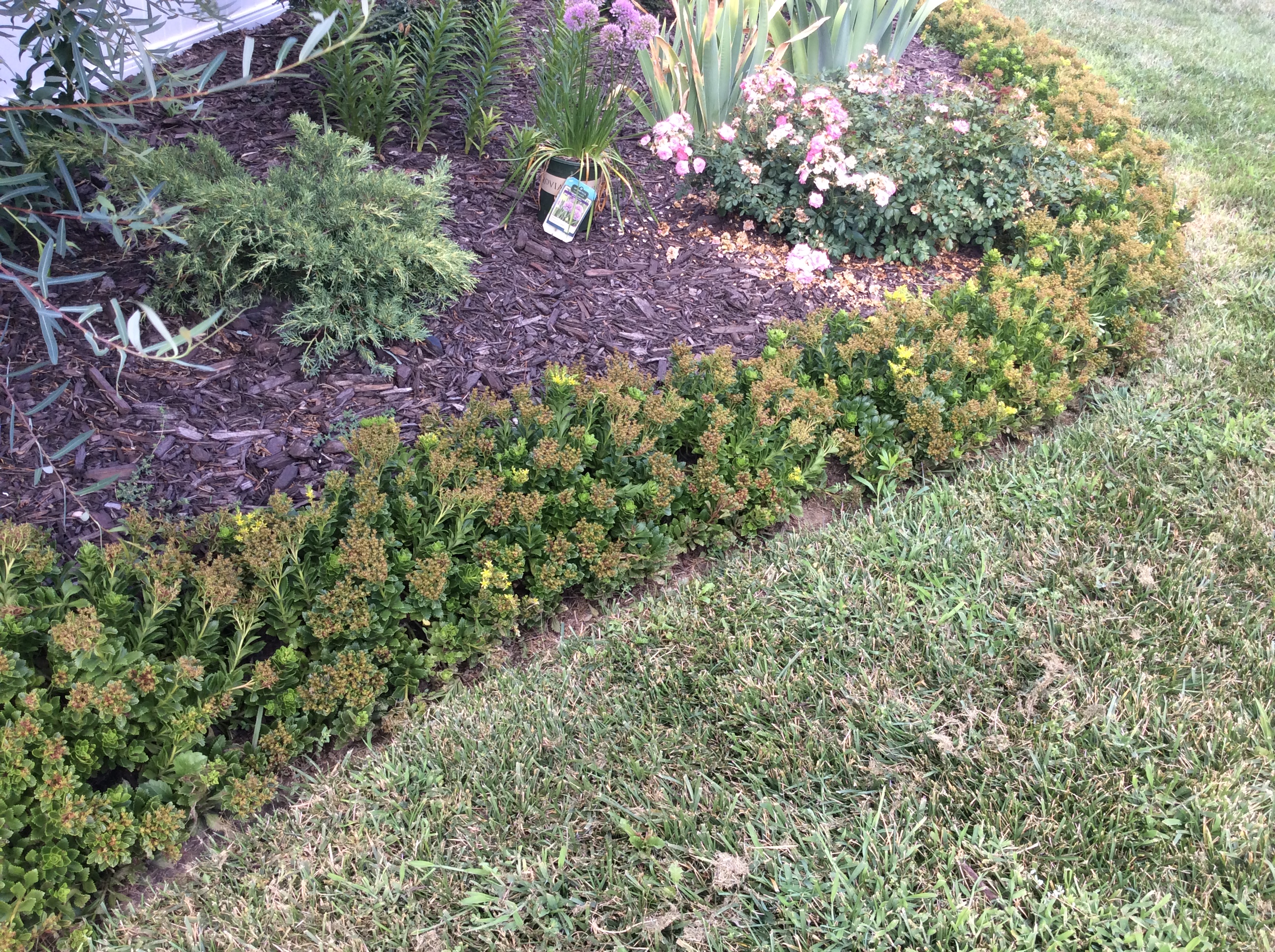 А теперь, рубрика «Вы спрашивали, мы отвечаем» Рассказываю про мой бордюр. У меня молч тоже уплывал после дождя в первый год. У нас за забором есть водяной коллектор, соответственно вся вода с молчим устремлялась туда)) Первое, что мы сделали, в самой низкой точке участка мы уложили дренажную трубу и накрыли ее камушками. Затем я сделала канавку по краю клумбы, отделив клумбу от газона. Глубина где-то 5-6 см., ширина 10-15 см. Эти расстояния не позволяют газону залезать не на свою территорию. Сама клумба немного приподнята относительно газона, где-то на 4 см. Это сделано для того, что бы вода, стекающая с крыши дома попадала точно в канавку, и по ней утекала за забор. На верхнем краю канавки, земля не плодородная, глинистая ( плодородную сразу бы водой унесло) и летом очень сухая Поэтому я подобирала специальные, очень тафф растения, которым будет окей расти в этой кондиции. Посадила я stonecop, на расстоянии 20см друг от друга Уже к началу второго года после посадки они образовали сплошную линию, которая прекрасно держит молч и + закрывает некрасивый глиняно-земляной край клумбы