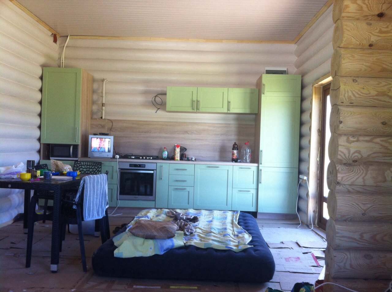 Зайдите попозже писал(а): Блин, красота какая!! Денег, наверно, вбухали немеряно. Ты знаешь,нет!!Подруга умеет везде выкрутить.Многое сами делали.Думали в50 тыщ $ уложиться.Но вышло 55 тысяч. Вот кухня еще.Все в процессе завершения. Газ подведен, електричество.Все удобства.  Вот справа на фотке бревна непокрашенные..Какие красивые разводы у дерева...Смотрел бы и рассматривал.