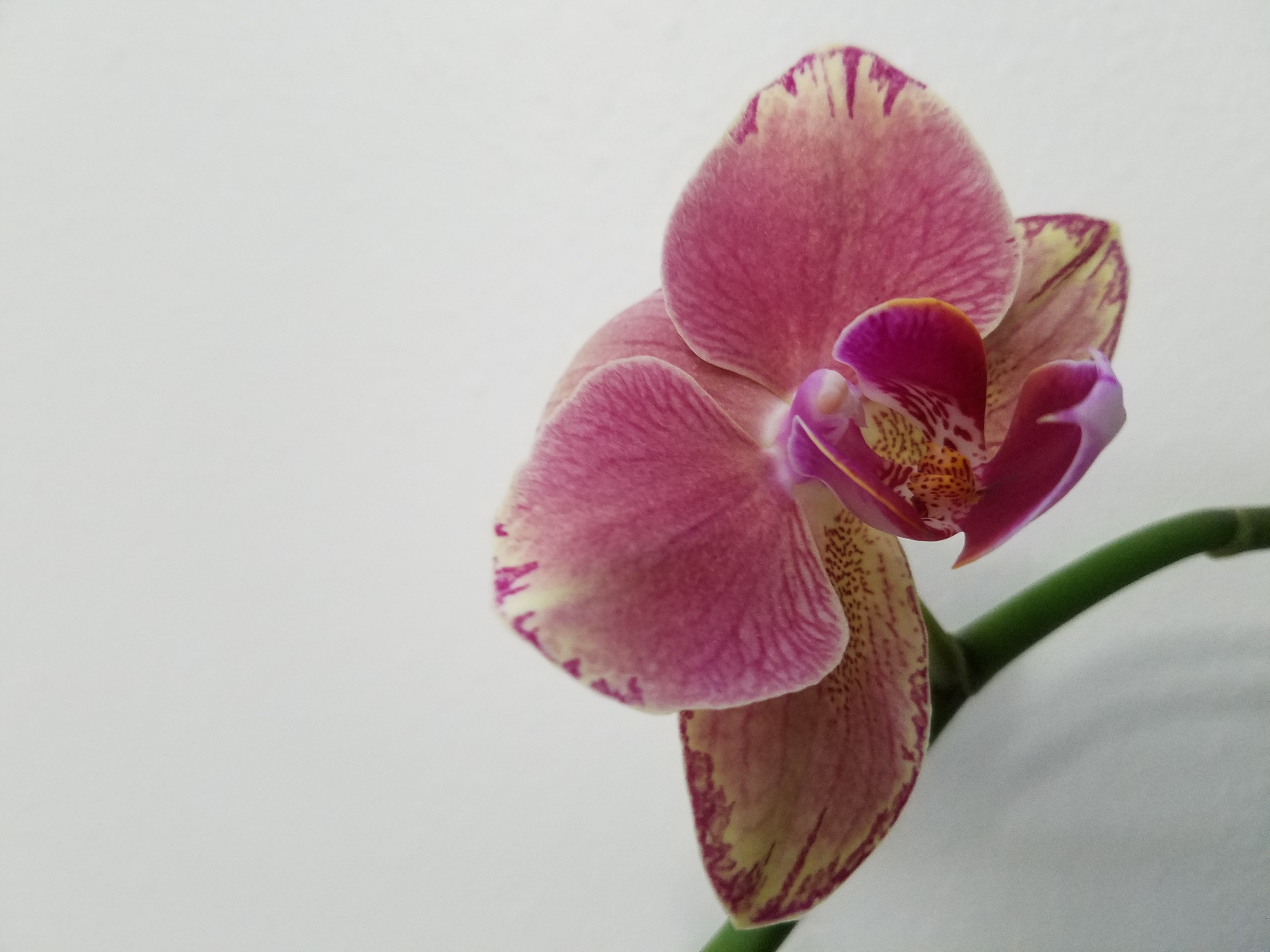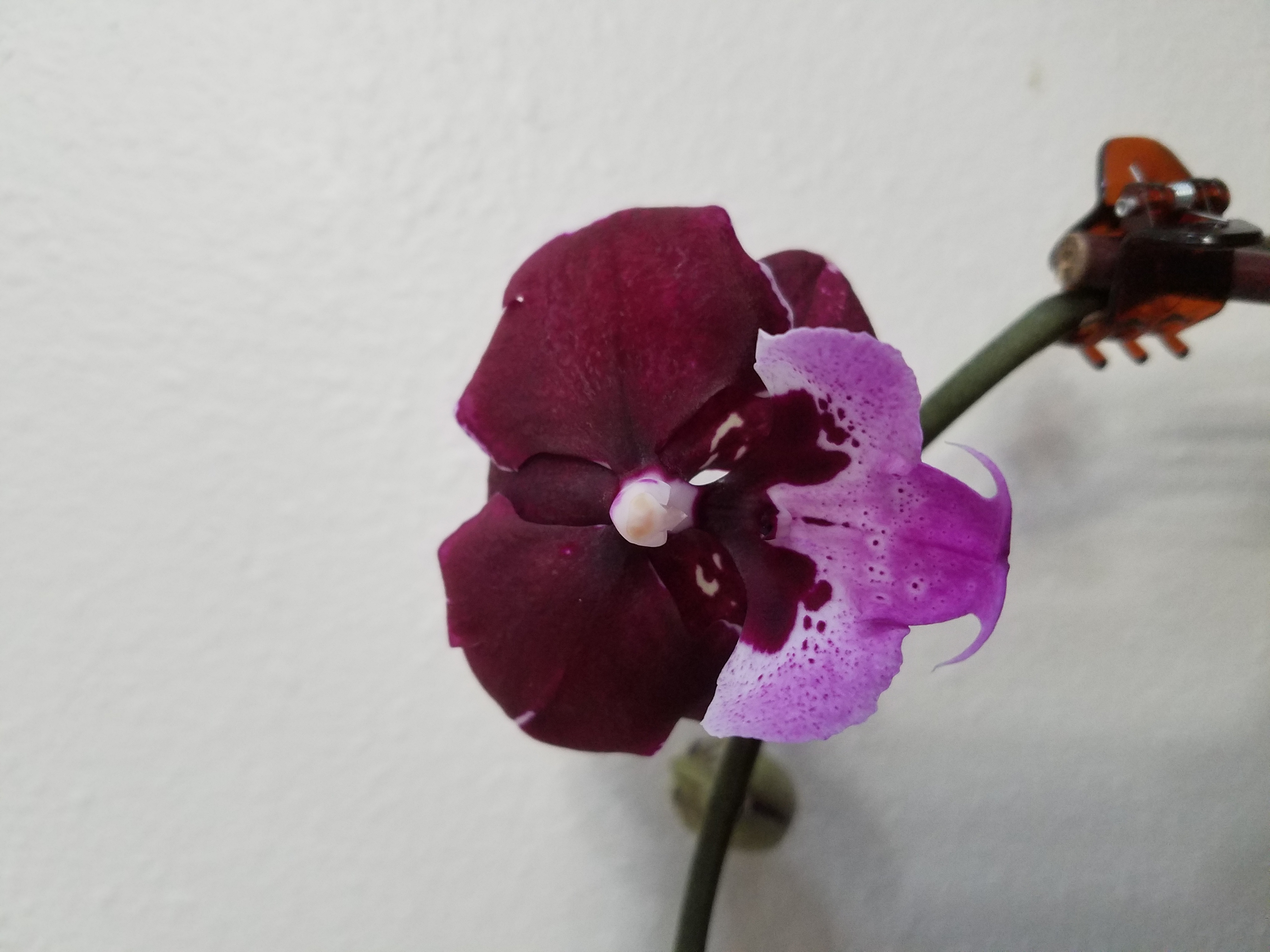 А это одна из моих первых. Цветы не крупные, но очень мне нравится расцветка. Адолоча, белая с поперечной полосой дала цветонос. Скоро заценим домашнее цветение