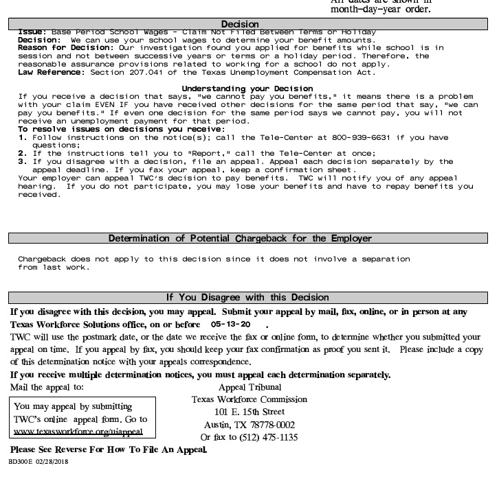 Они пишут что ты зааплаилась во время учебного года, посему у тебя не тот случай когда школы на каникулах и получать анэмплоымент учителя не могут по закону. Вот тут посмотри https://www.tasbrmf.org/learning-news/insiderm/home/coverage/unemployment-compensation/letters-of-reasonable-assurance-and-the-end-of-the.aspx Ну вот я так же поняла, но дама с той группы на фейсбуке написала что мне отказали. Мнения у народа разделились.