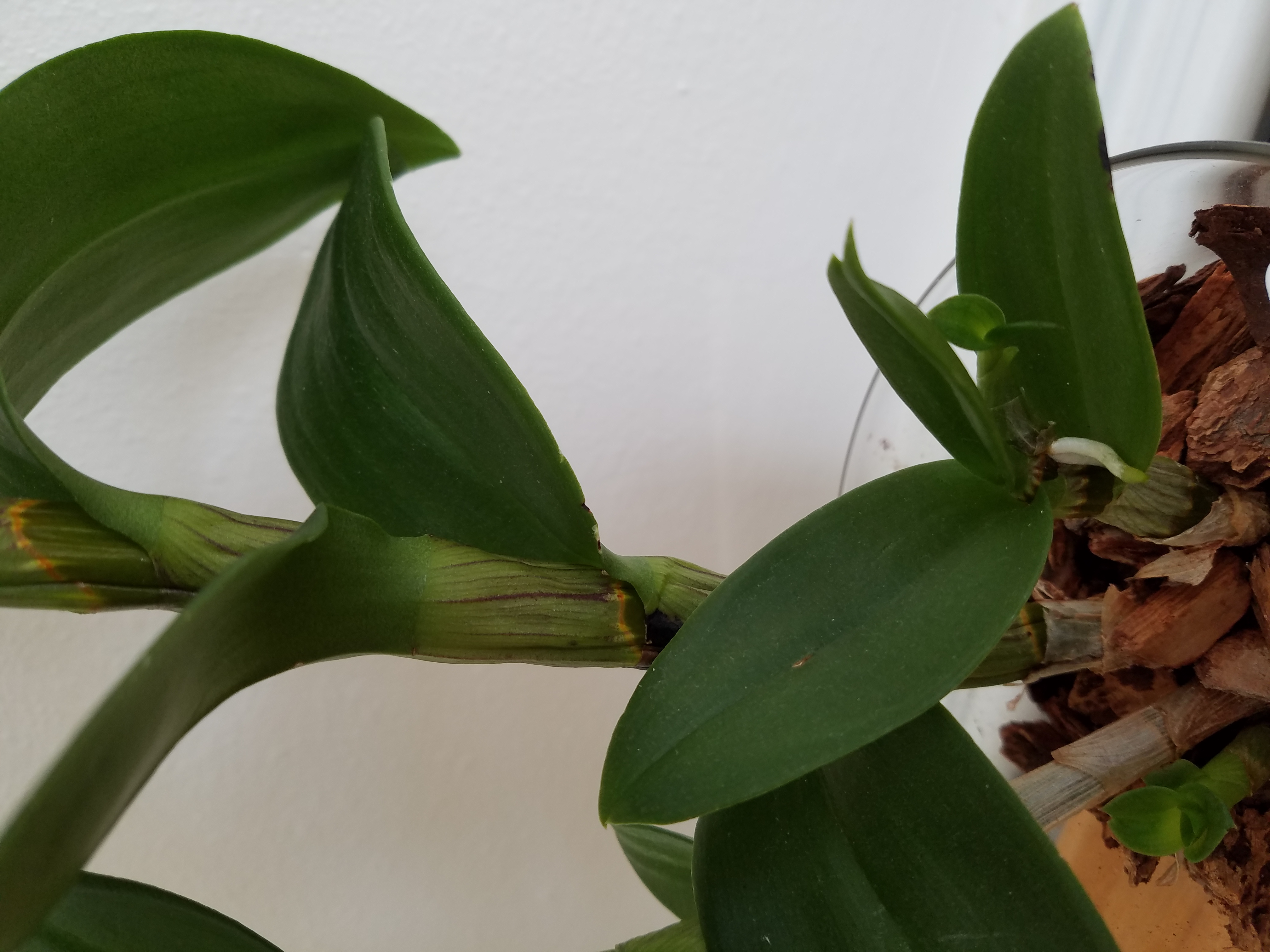 Девы, что мой дендрофал вытворяет? Почему-то цветонос вылез сбоку, из него выперся корень и врос в нижний лист... На маленькой бульбе новый росток с корешком- это, похоже, детка