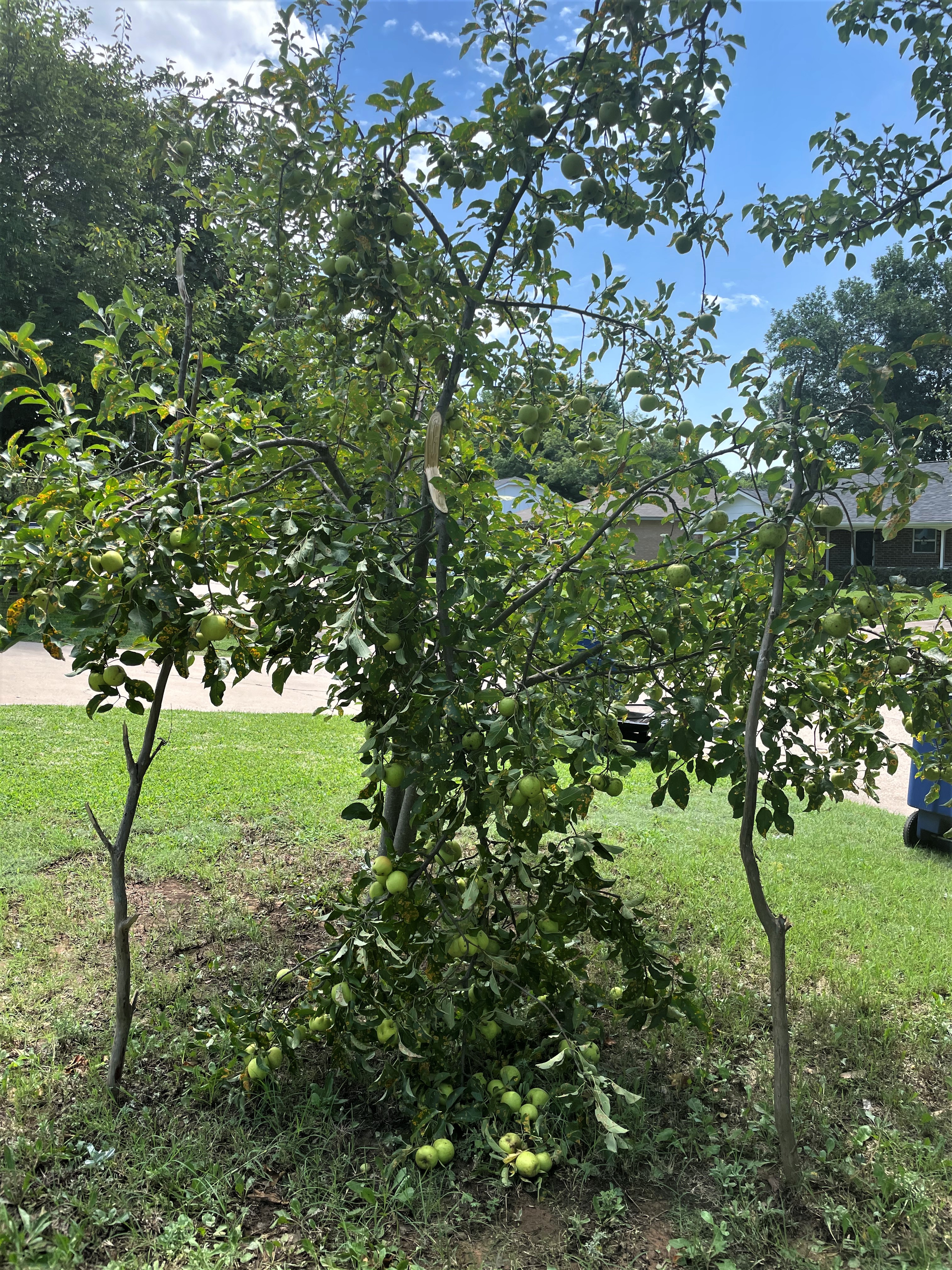у нас вчера ночью налетел внезапный ветрище с дождищем...или ветрина с дождиной?  Короче, сломал мне яблоню, гад. И тот и другой. Ветки подпертые ничего, только яблоки немного отвалились, а сломался ствол, тоже тяжелый был, яблочный год...Хорошо хоть не очень низко, но пол дерева тогось. Неудачливая яблонька, то понос, то золотуха у нее, никак не вырастет, а уж лет 13 ей, одновременно с персиком и абрикосом сажали. Персик уж почил, мой прекрасный трудоголик, абрикос - здоровенный детина, а яблоня все как молодая  и вот опять.