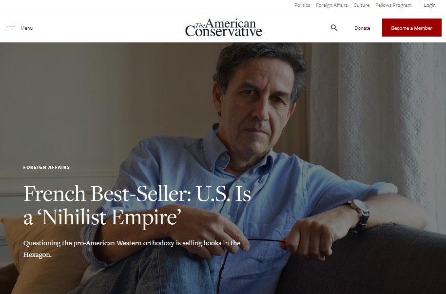 ▪️«Штаты ведут либеральный мир в пропасть», — констатирует (https://www.theamericanconservative.com/french-best-seller-u-s-is-a-nihilist-empire/) американский The American Conservative, цитируя автора книги «Поражение Запада», точно предсказавшего распад СССР