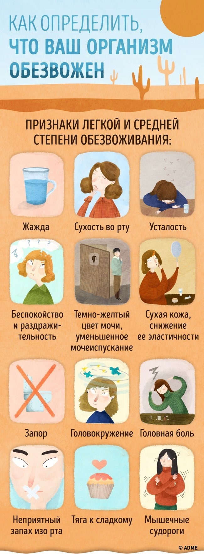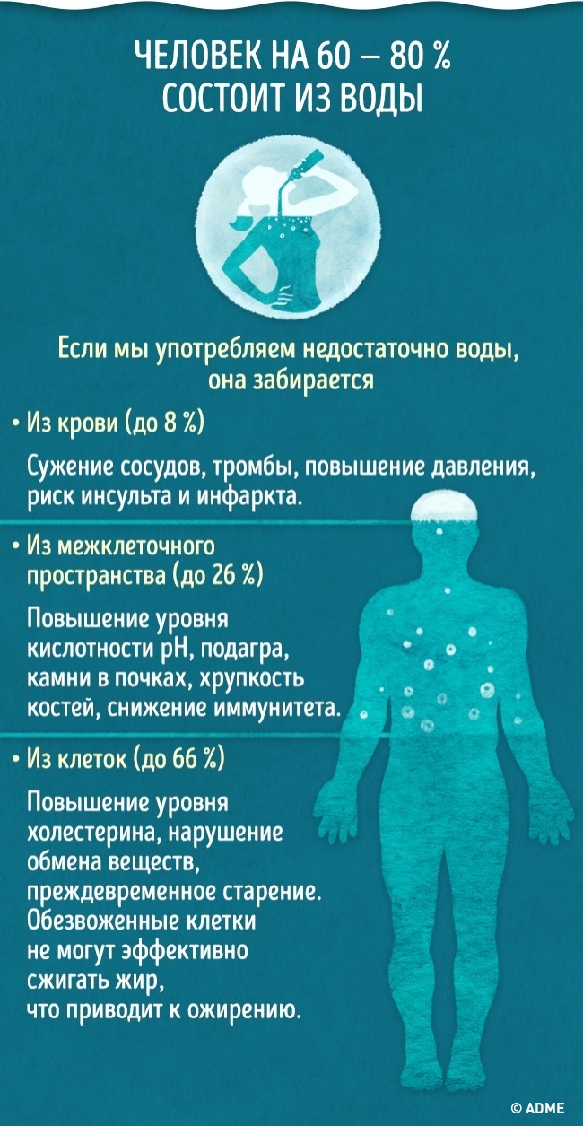 AdMe.ru подготовил инфографику, которая поможет понять, достаточное ли количество воды вы употребляете и как влияет обезвоживание на ваш организм.