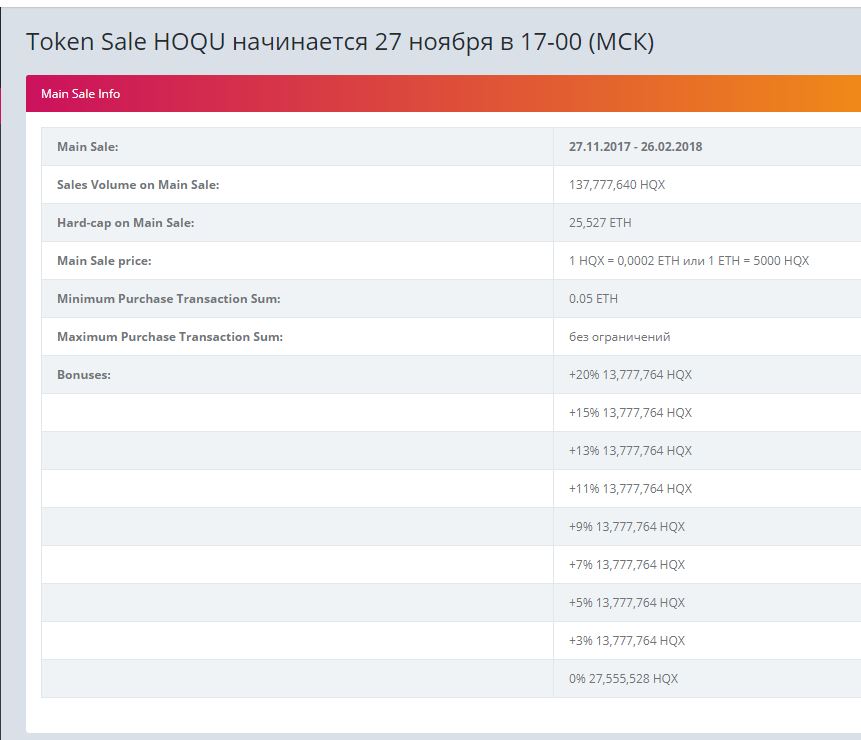 Token Sale HOQU начинается 27 ноября в 17-00 (МСК), discount with my referral 1%: