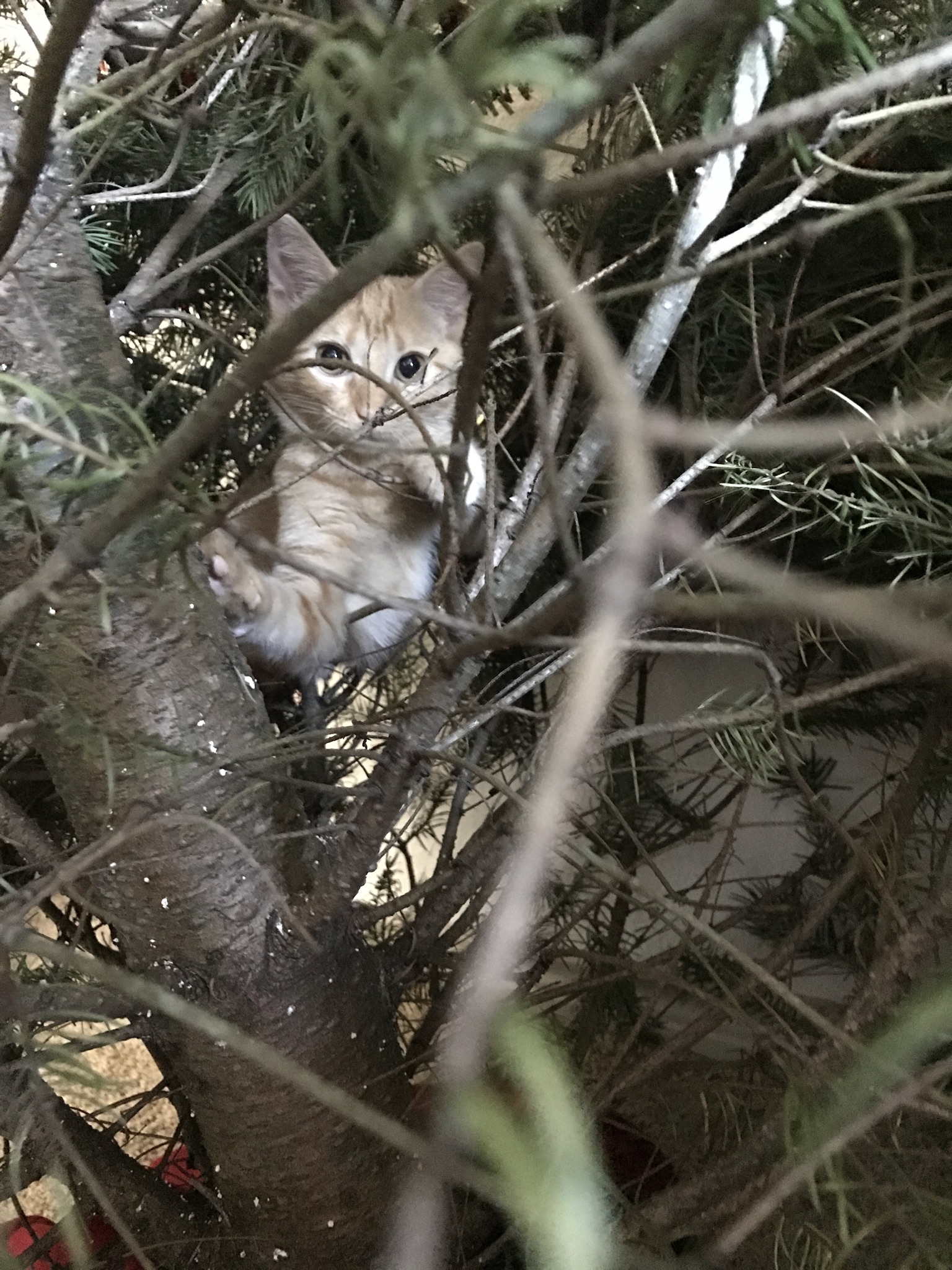Елку принесли, пока игрушки разбирали, котёнок уже залез. Но она может укололась, может поумнела, больше не лезет.