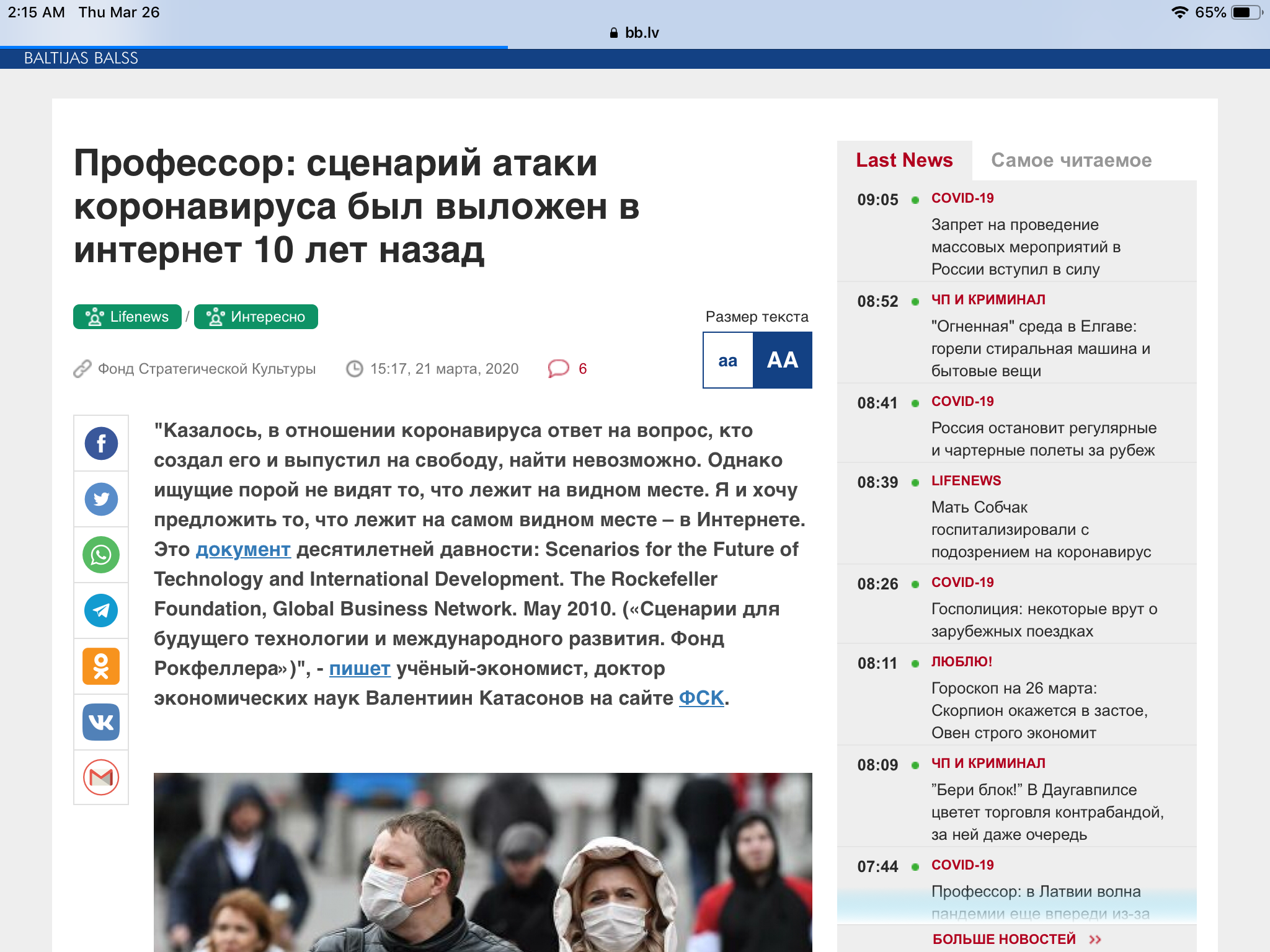 https://youtu.be/tSXIImYYjq4 Я вчера это видео постила. Все по полочкам Квачков разложил.Без всяких истерик и нагнетания хайпа.Не знаю, где правда, но почему-то верится этому генералу. Админ, мне кажется, все равно этот созданный вирус, куда опаснее,чем многие думали поначалу. А самое главное, что будет со всем миром после этого....  Посмотрим. Вот на долю нашего поколения то 90-е, то корона.