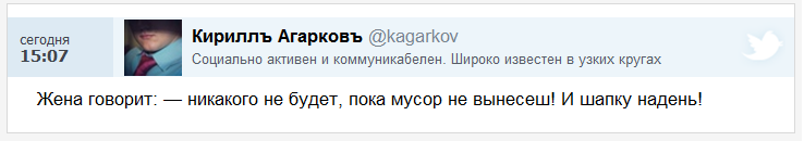 Комменты жгут..... Цитата: Жена говорит: — никакого не будет, пока мусор не вынесеш! И шапку надень! http://www.kp.ru/daily/26005/2930683/