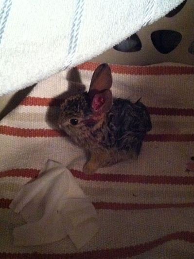 Будьте осторожны - животное дикое и может иметь кучу болячек. Только вчера на лекции нам рассказывали о случаях сифилиса, передавшегося от кроликов к охотникам в Йоркшире. Лучше отвезти животное в приют - там разберутся и окажут помощь.