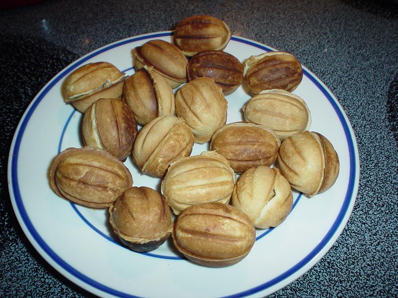 Я вот у нас в русском маг купила такую орешницу. Сегодня пробовала печь на плите-она у меня стеклянная. Вот мои орешки. Девченки,а вы их с обеих сторон печете? Я только с одной пекла. Начинку сделала из пинатбатера и окрошек. Завтра понесу на работу-сослуживцам попробовать.