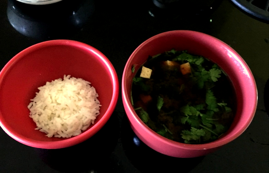 Позавчера на ужин готовила мисо суп (мисо-паста/темная, водоросли вакаме, ginger, тофу, много зелени). Отдельно приготовила рис для супа, добавлять кому сколько надо. Ещё были сухарики.