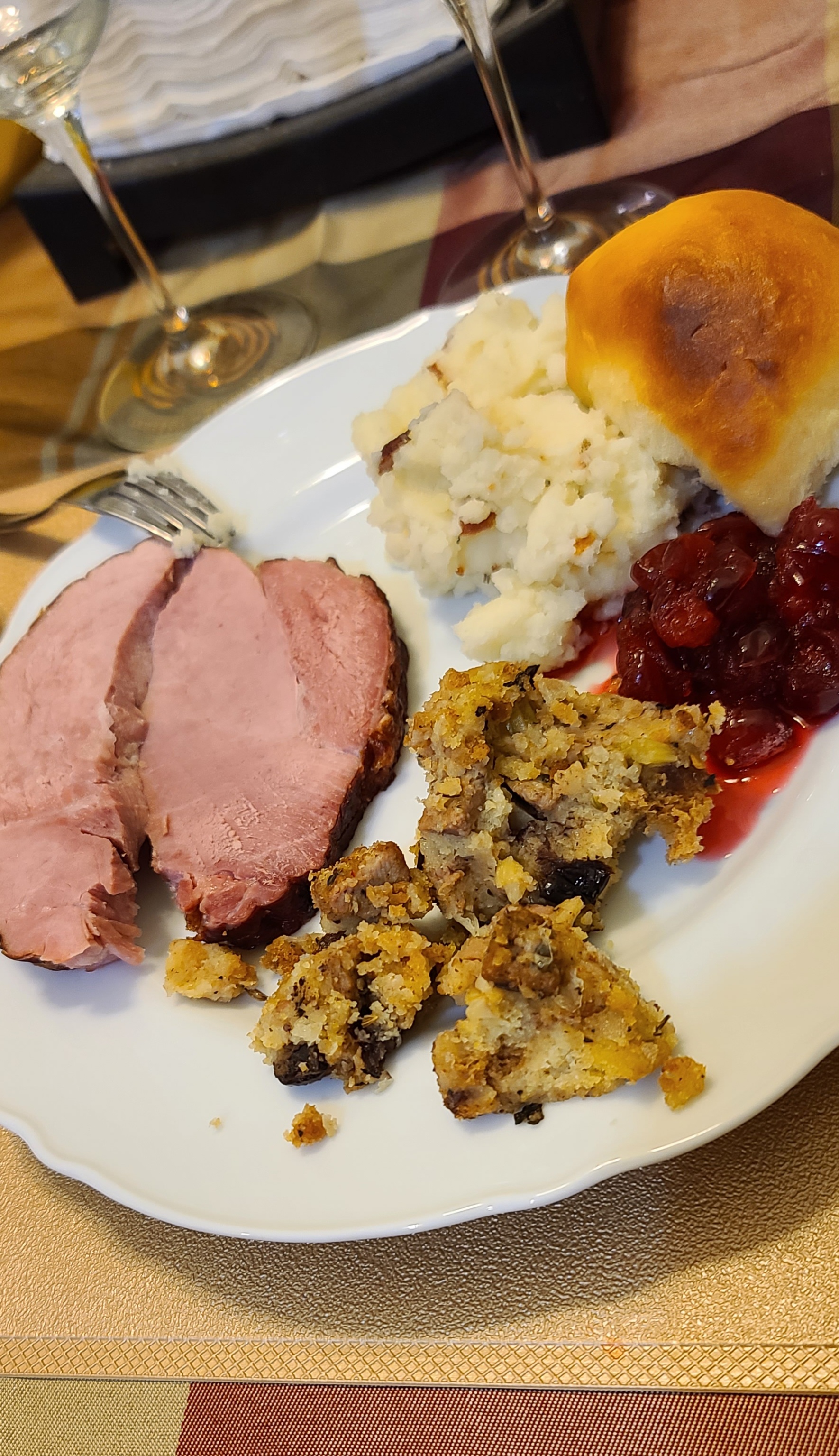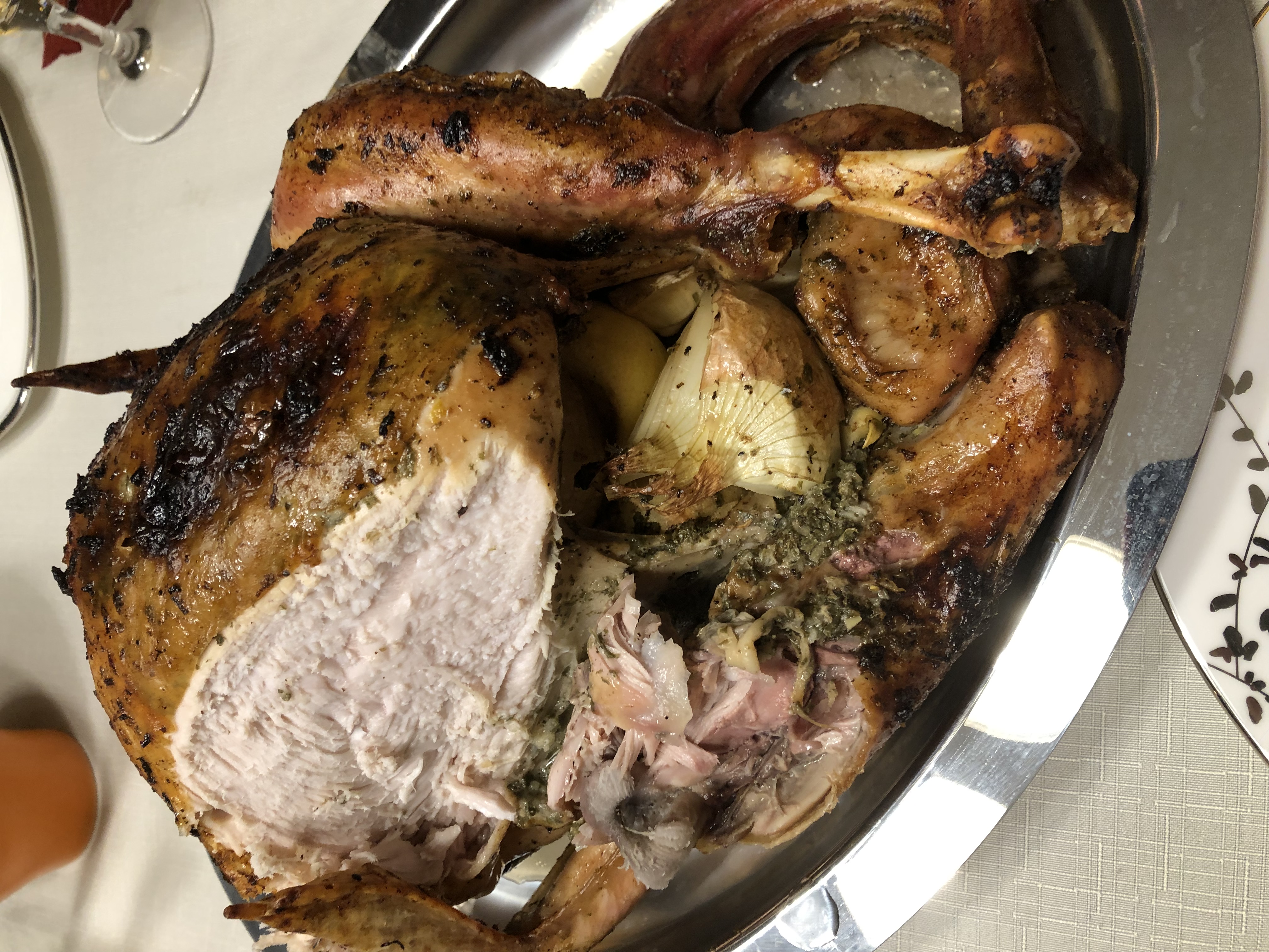 А мы такие голодные были пока весь день готовили, что я не успела ничего щелкнуть кроме мужа турки. В этом году список меню был длинный: турка, ростэт курица, хэм в духовке в кисло-сладком соусе. На гарнир: пюре, sweet potato casserole, green beans, black beans, corn Alfredo, macaroni cheese. Desert: apply pie, pistachio weeping cream pie, pumpkin pie, honey cake and cheesecake. We had a family over.